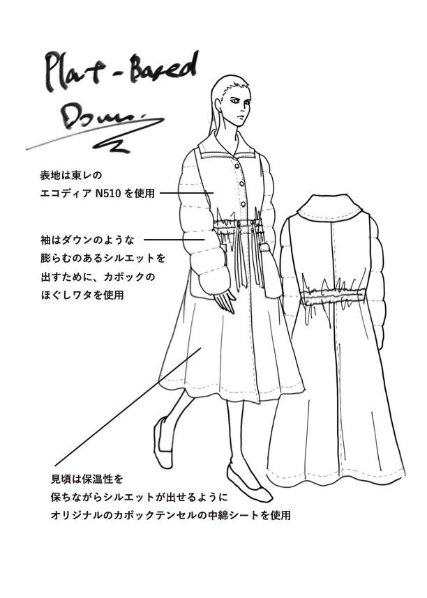 たしかに、環境に配慮した素材でものづくりを行うと、耐久性が弱くなったり価格が高くなったりと制約があり、結果的にシンプルなものしか作れないというのがこれまでの考え方でした。しかし、私たちは耐久性や機能性もあり、遊びごころのあるデザインで、環境負荷の低いファッションを目指したい。欲張りかもしれませんが、そんな想いで今回100%植物由来のダウンウェアに挑戦しました。