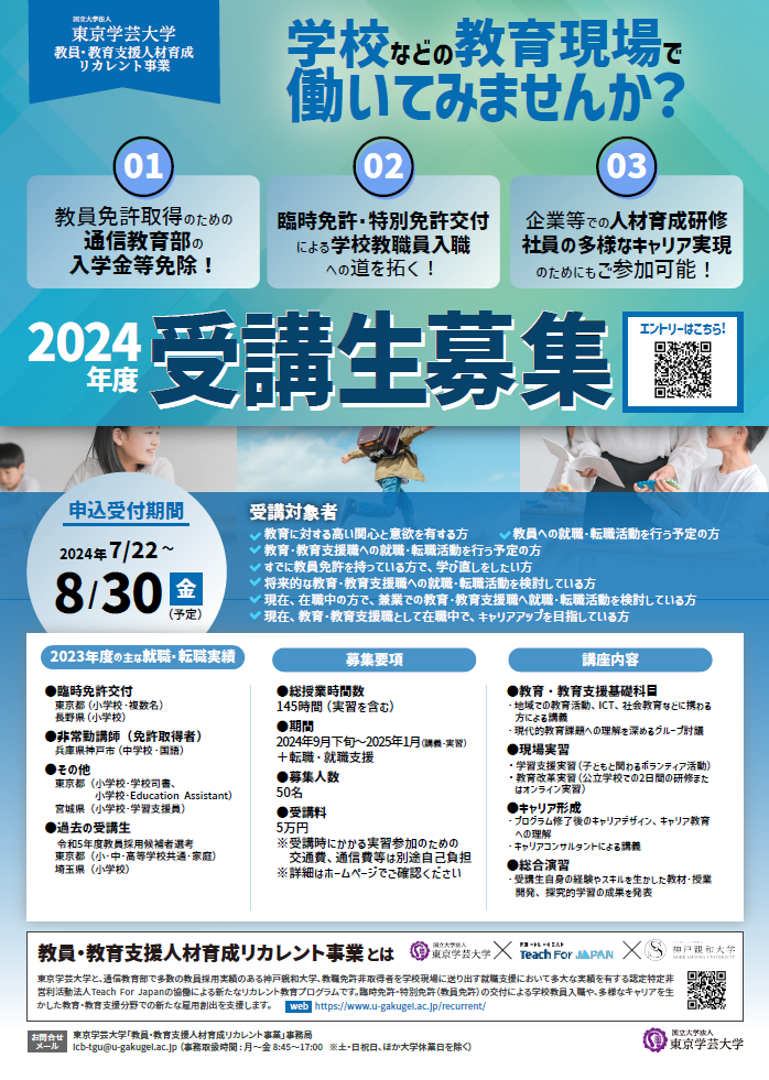 本学と、通信教育部で多数の教員採用実績のある神戸親和大学、教職免許非取得者を学校現場に送り出す就職支援において多大な実績を有する認定特定非営利活動法人Teach For Japanの協働による「質の高い社会人から教員へのリカレントプログラム」です。現代的な教育課題について様々な背景を持つ受講生とともに学び合う講義や、小中学校での実習を取り入れた実践的なプログラムが特色です。