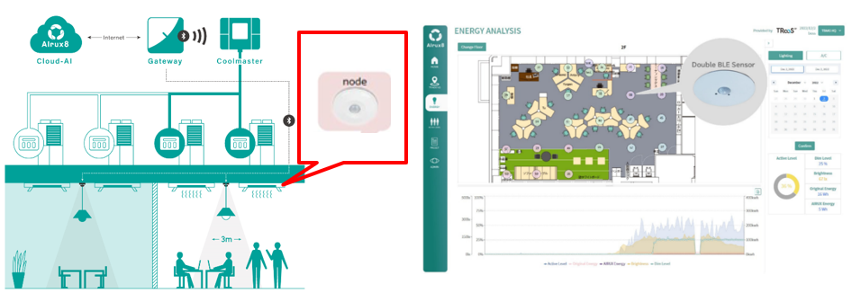 AIrux8は、天井に設置された人感センサーを組み込んだ「Node(ノード)」と呼ばれるセンサーを通して、施設内の混雑状況や空間温度などの環境データを取得いたします。その取得された環境データは、本特許アルゴリズムにより空間マトリクスに斥力エネルギー量としてマッピングされ、空調による温度変化で消費されるエネルギー量を事前に予測することで、最適な温度変化の解を得ることが出来る仕組みになっております。当社は、その制御ロジックと環境データをクラウドに集積しており、データが増えれば増える程、他社が追随できないサービスに育って行くと考えております。その結果、AIrux8を導入することで環境温度と設置される建物の特性に応じた温度調整ロジックが最適化されることになり、消費電力を大幅に抑えることが可能になります。