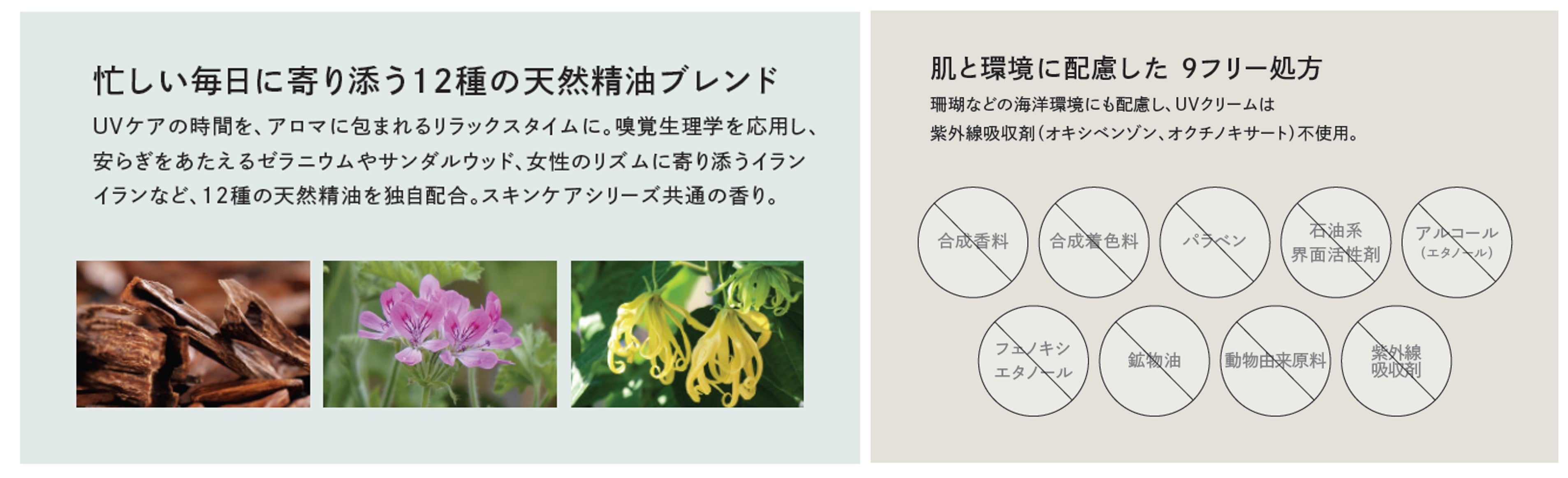 天然の精油の心地よい香り。ノンケミカル処方*で、肌だけでなく環境にも配慮した9つのフリー成分