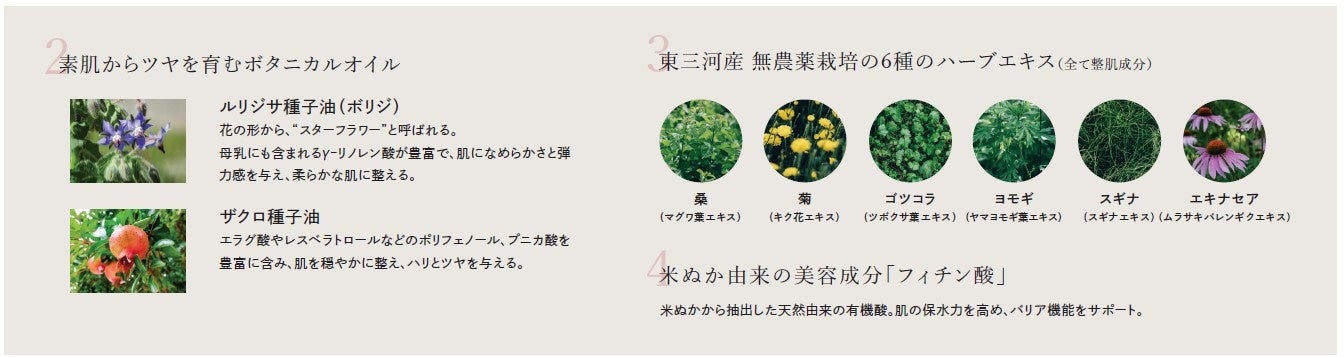 美容液成分79%以上。東三河の国産ハーブ6種に加え、2種のボタニカルオイル、米ぬか由来のフィチン酸(保湿成分)など、紫外線による肌ダメージをケアし、うるおいを与える植物由来のエイジングケア***成分をたっぷり配合。スフレのようになめらかなクリームが、肌の凹凸にしなやかに密着して1日中うるおいで包み込みます。
