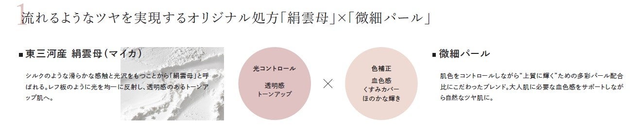毛穴や凹凸・くすみ、色ムラなど、大人の肌悩みをカバー。流れるようなツヤを実現するオリジナル処方