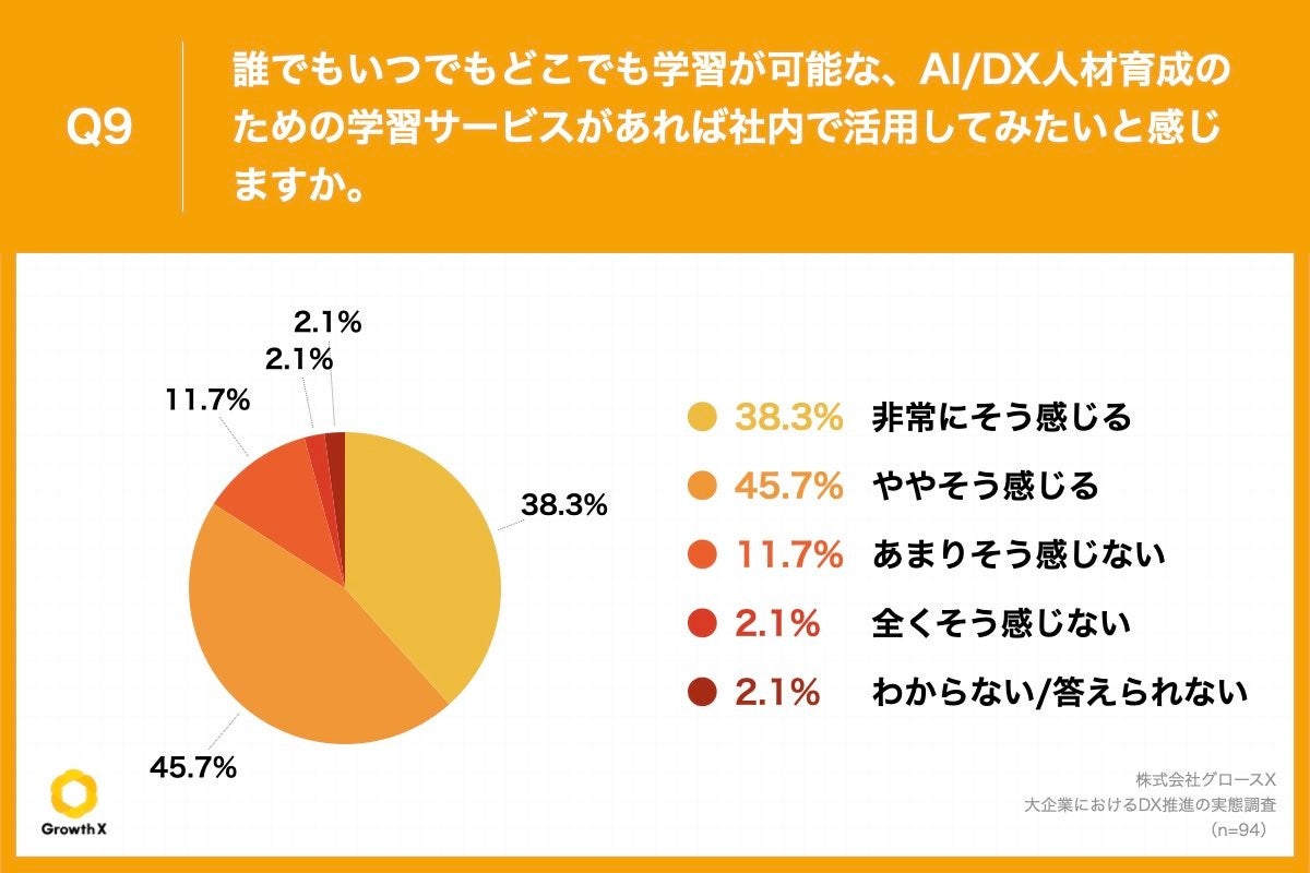 Q1で「会社からは「価値の創出」「抜本的な変革」は求められていない/特に取り組んでいない」「わからない/答えられない」以外を回答した方に、「Q9.誰でもいつでもどこでも学習が可能な、AI/DX人材育成のための学習サービスがあれば社内で活用してみたいと感じますか。」(n=94)と質問したところ、「非常にそう感じる」が38.4%、「ややそう感じる」が45.7%という回答となりました。