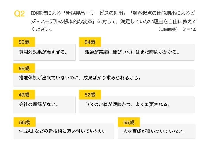 Q1で「あまり満足していない」「全く満足していない」と回答した方に、「Q2.DX推進による「新規製品・サービスの創出」「顧客起点の価値創出によるビジネスモデルの根本的な変革」に対して、満足していない理由を自由に教えてください。(自由回答)」(n=42)と質問したところ、「費用対効果が悪すぎる」や「人材育成が追いついていない」など30の回答を得ることができました。