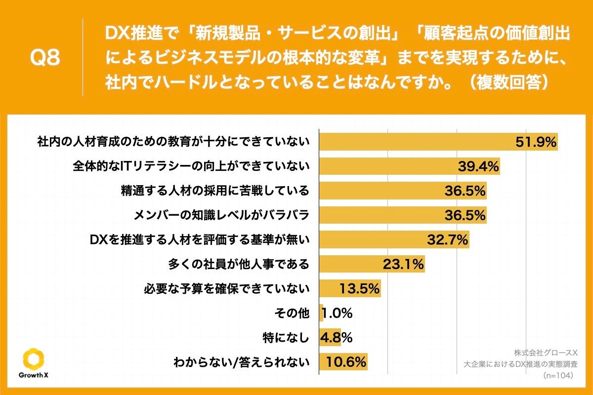 「Q8.DX推進で「新規製品・サービスの創出」「顧客起点の価値創出によるビジネスモデルの根本的な変革」までを実現するために、社内でハードルとなっていることはなんですか。(複数回答)」(n=104)と質問したところ、「社内の人材育成のための教育が十分にできていない」が51.9%、「全体的なITリテラシーの向上ができていない」が39.4%、「精通する人材の採用に苦戦している」が36.5%、「メンバーの知識レベルがバラバラ」が36.5%という回答となりました。