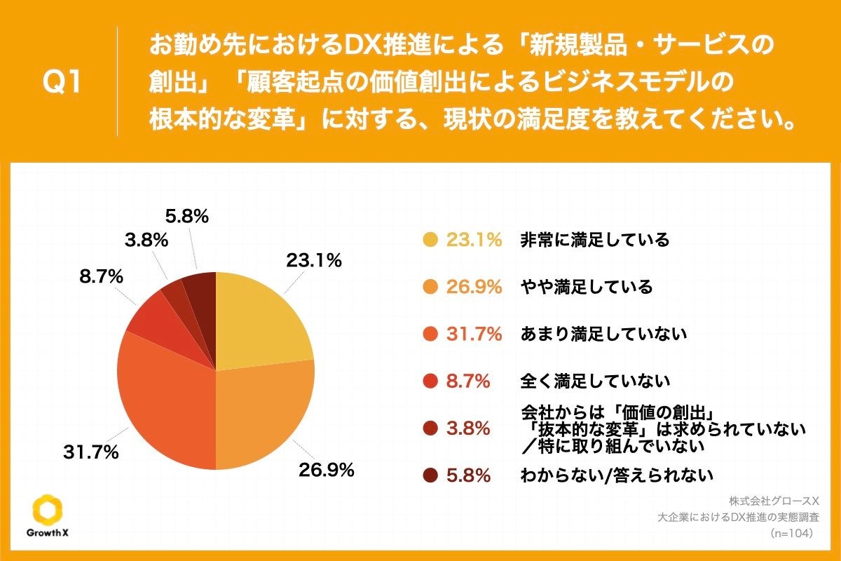 「Q1.お勤め先におけるDX推進による「新規製品・サービスの創出」「顧客起点の価値創出によるビジネスモデルの根本的な変革」に対する、現状の満足度を教えてください。」(n=104)と質問したところ、「非常に満足している」が23.1%、「やや満足している」が26.9%という回答となりました。