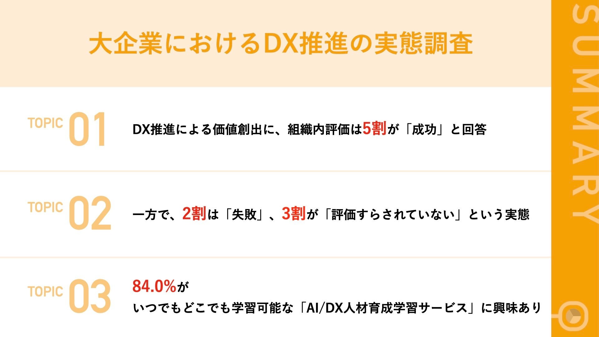 今回の調査では、大企業でDX推進に関わっている幹部が、DX推進において概ね「満足」、「成功している」と考えているものの、社内の人材育成や会社全体でのリテラシーレベルに関しては、課題を感じている実態が明らかとなりました。「誰でもいつでもどこでも学習が可能な、AI/DX人材育成のための学習サービスがあれば社内で活用してみたいか」という質問に対しては、8割以上が「活用してみたい」と回答しており、今後のDX人材育成に関しては、各企業が抱えている課題解決に特化したサービスの導入が重要と言えるのではないでしょうか。