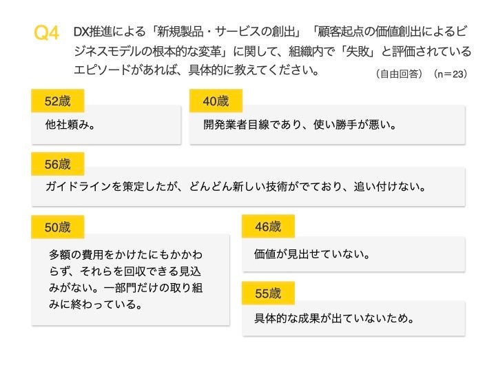 Q3で「まあまあ失敗と見られている」「大失敗と見られている」と回答した方に、「Q4.DX推進による「新規製品・サービスの創出」「顧客起点の価値創出によるビジネスモデルの根本的な変革」に関して、組織内で「失敗」と評価されているエピソードがあれば、具体的に教えてください。(自由回答)」(n=23)と質問したところ、「価値が見出せていない」や「使い勝手が悪い」など14の回答を得ることができました。