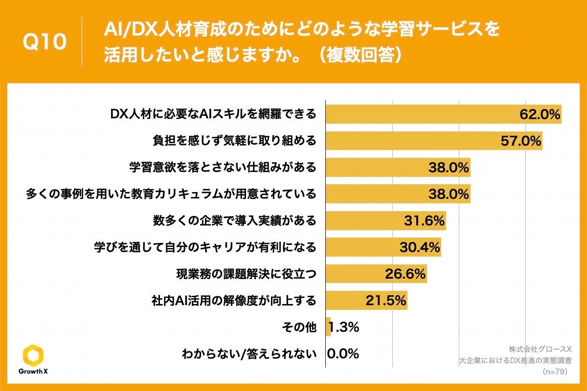 Q9で「非常にそう感じる」「ややそう感じる」と回答した方に、「Q10.AI/DX人材育成のためにどのような学習サービスを活用したいと感じますか。(複数回答)」(n=79)と質問したところ、「DX人材に必要なAIスキルを網羅できる」が62.0%、「負担を感じず気軽に取り組める」が57.0%、「学習意欲を落とさない仕組みがある」が38.0%、「多くの事例を用いた教育カリキュラムが用意されている」が38.0%という回答となりました。