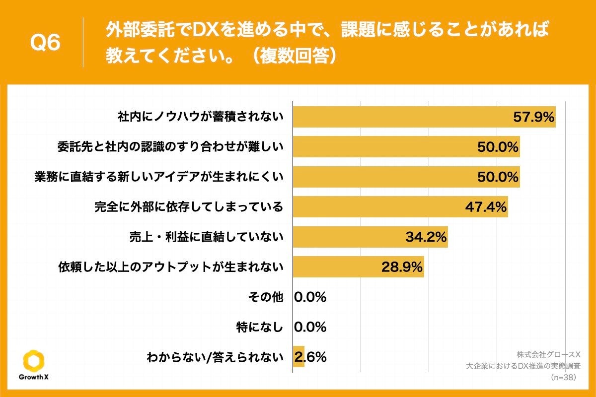 Q5で「ITコンサルタントなどへの外部委託」と回答した方に、「Q6.外部委託でDXを進める中で、課題に感じることがあれば教えてください。(複数回答)」(n=38)と質問したところ、「社内にノウハウが蓄積されない」が57.9%、「委託先と社内の認識のすり合わせが難しい」が50.0%、「業務に直結する新しいアイデアが生まれにくい」が50.0%という回答となりました。
