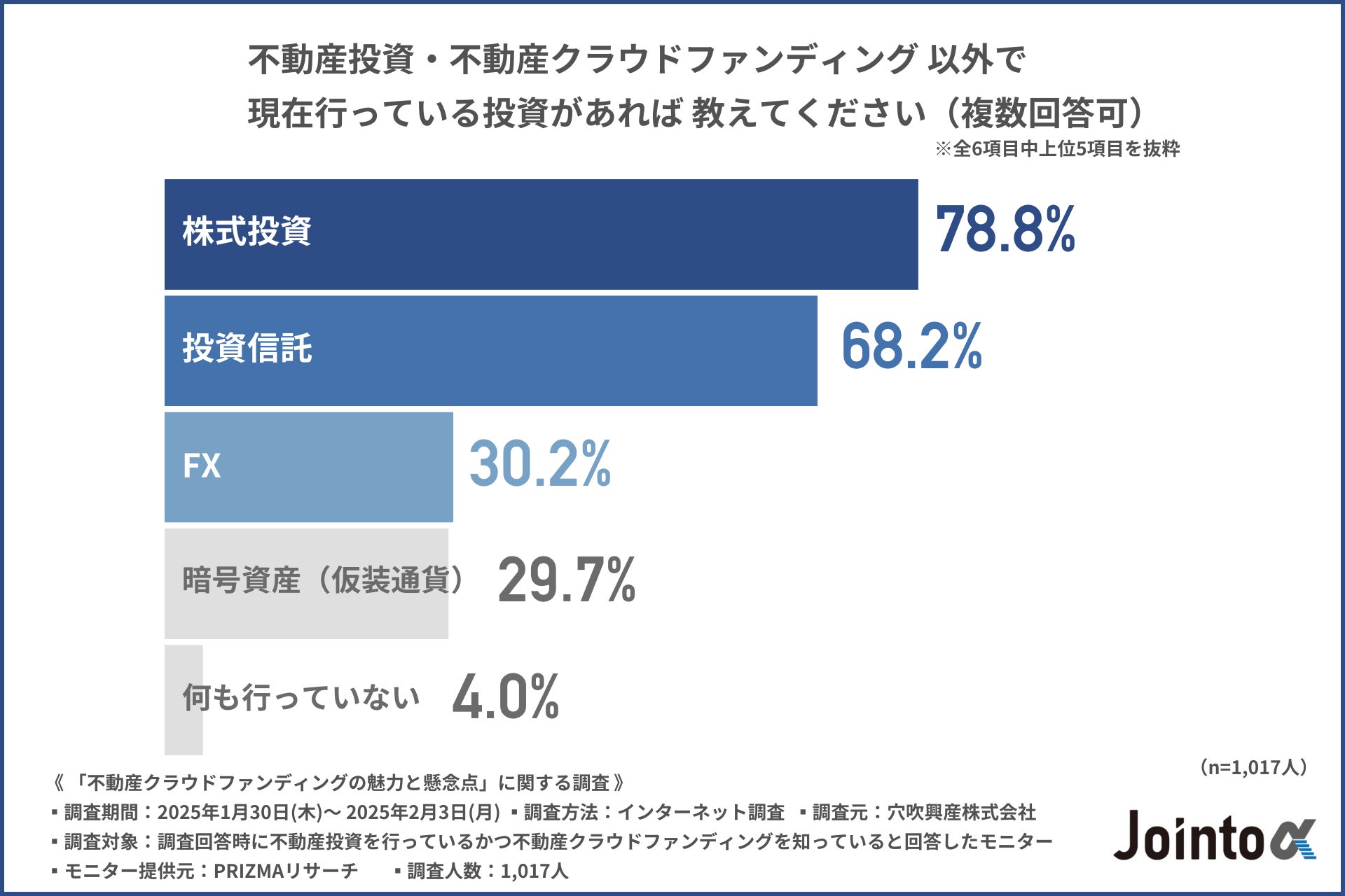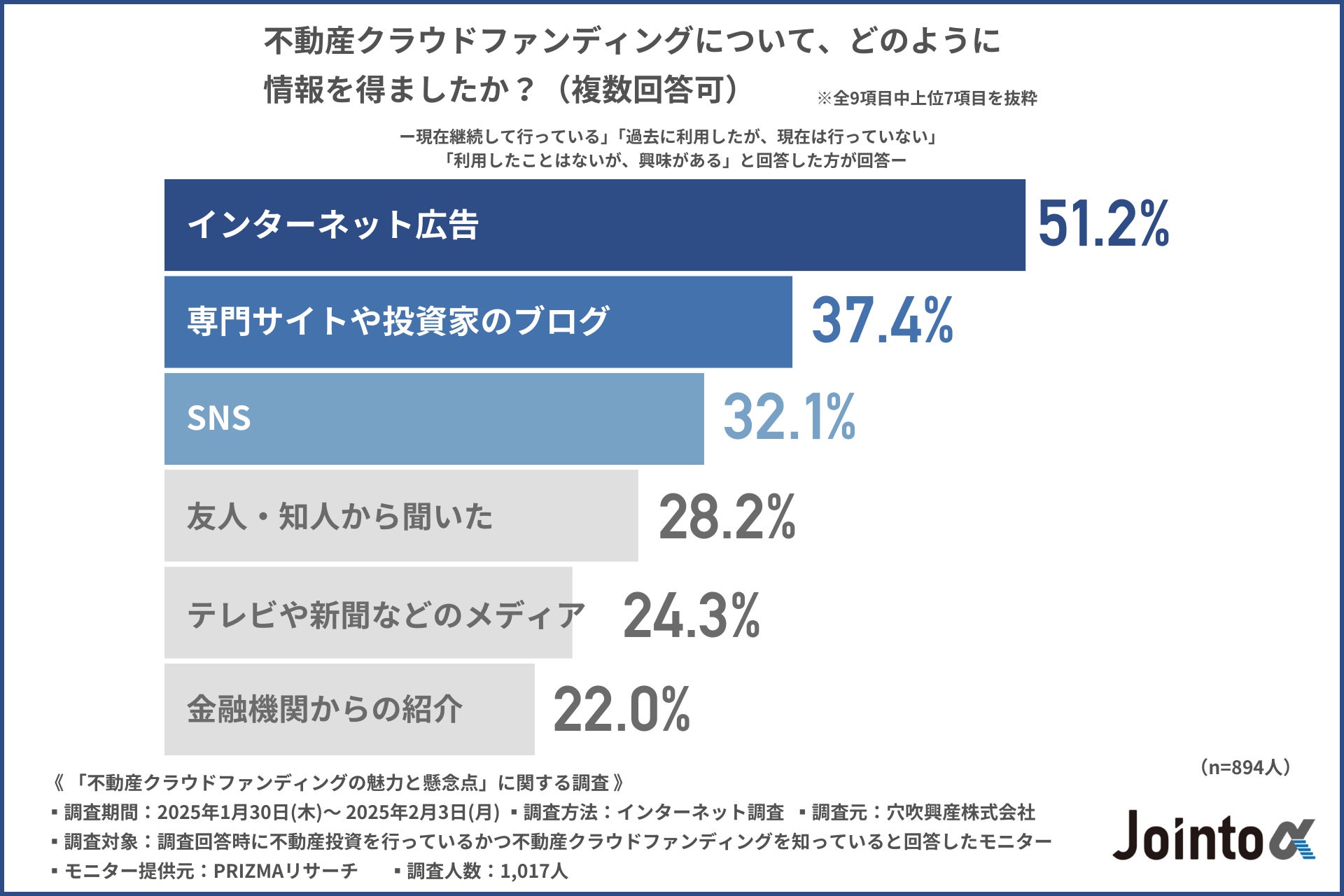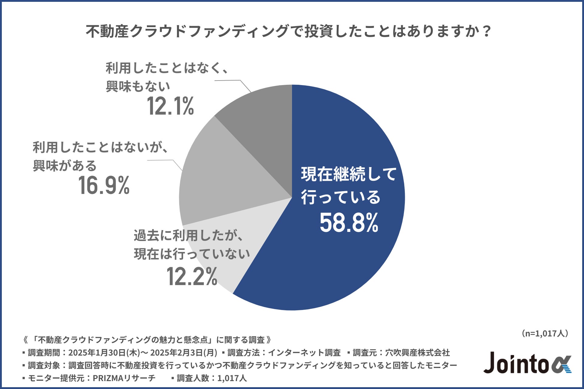 そこで今回、不動産クラウドファンディング『Jointo α(ジョイントアルファ)』(https://join-to.jp/)を運営する穴吹興産株式会社は、不動産投資を行っているかつ不動産クラウドファンディングを知っている方を対象に、「不動産クラウドファンディングの魅力と懸念点」に関する調査を実施しました。