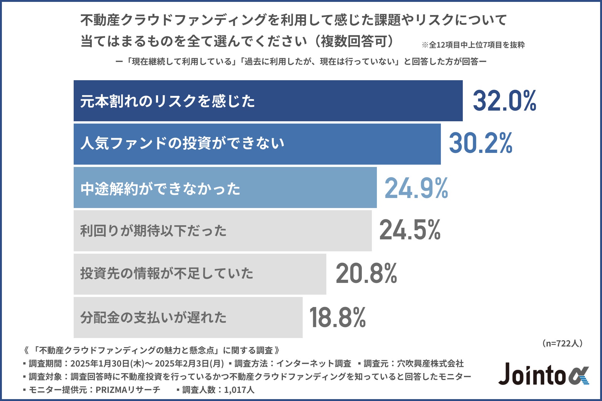 「不動産クラウドファンディングを利用して感じた課題やリスクについて当てはまるものを全て選んでください(複数回答可)」と質問したところ、『元本割れのリスクを感じた(32.0%)』と回答した方が最も多く、次いで『人気ファンドの投資ができない(30.2%)』『中途解約ができなかった(24.9%)』となりました。