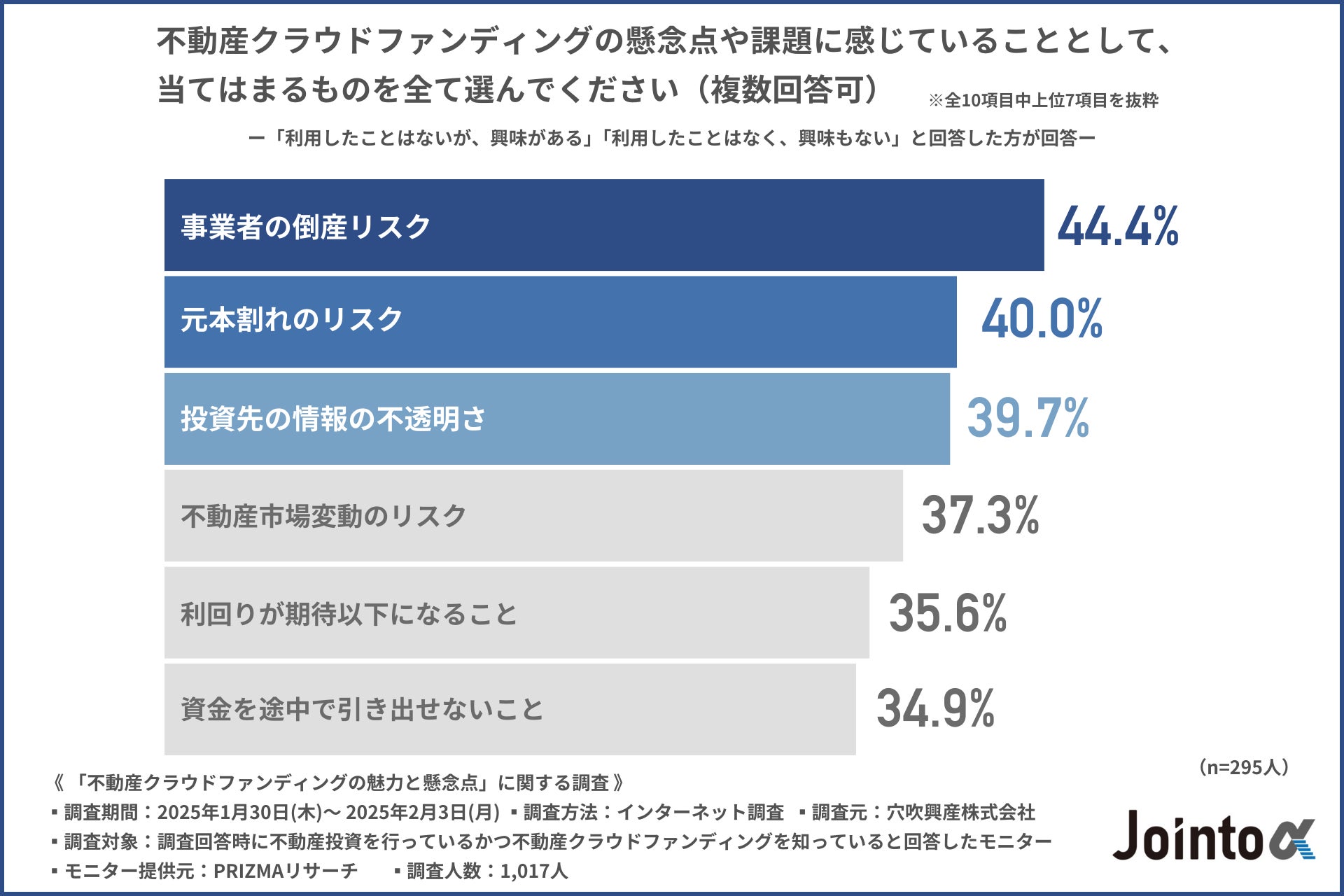 「不動産クラウドファンディングの懸念点や課題に感じていることとして、当てはまるものを全て選んでください(複数回答可)」と質問したところ、『事業者の倒産リスク(44.4%)』と回答した方が最も多く、次いで『元本割れのリスク(40.0%)』『投資先の情報の不透明さ(39.7%)』となりました。