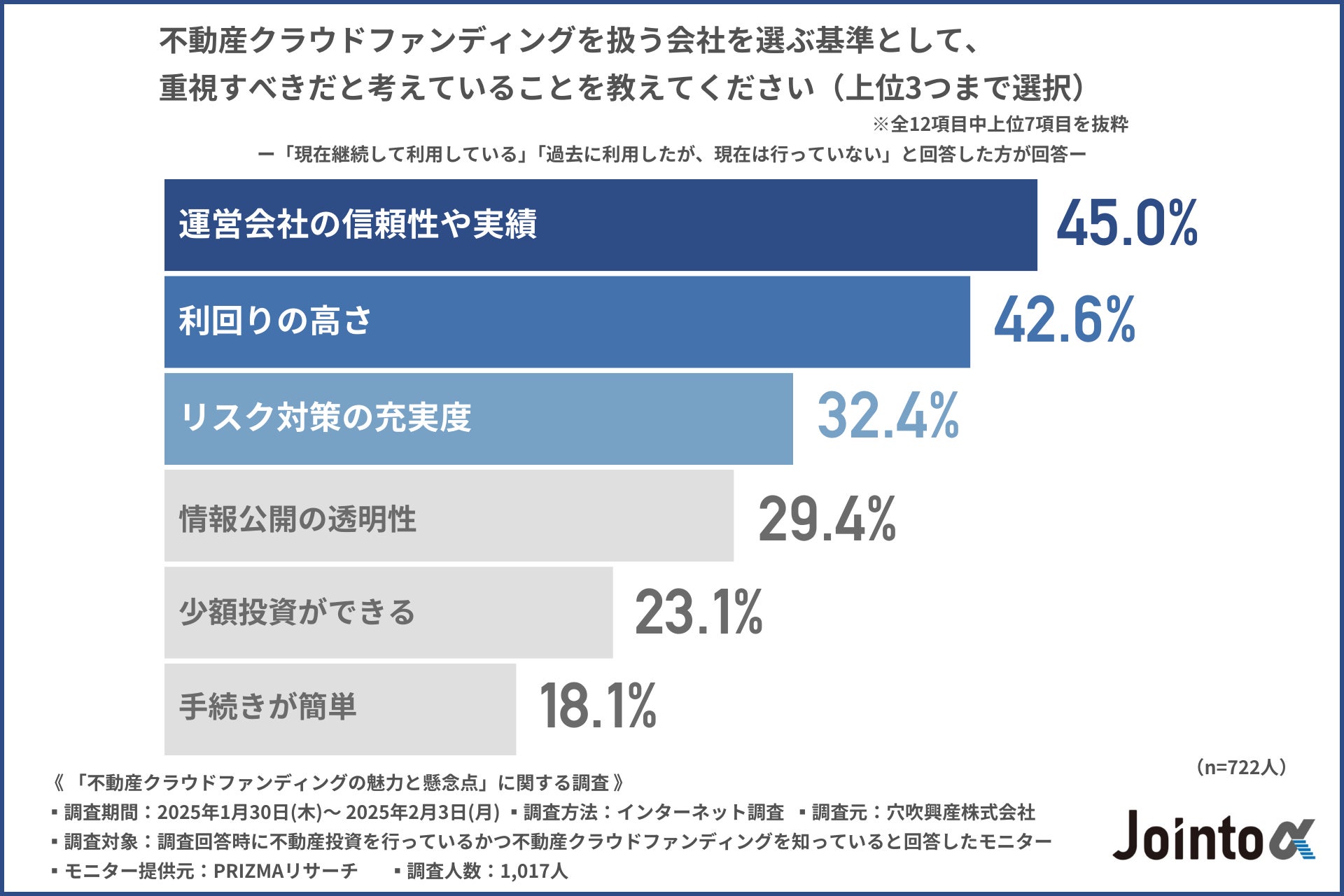 運営会社の信頼性を重視すべきだと考える方が多く、また利回りの高さやリスク対策も会社を選ぶ際に重要な要素と考えていることがわかりました。