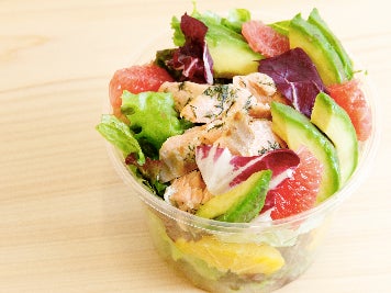 生姜とディルをのせて焼き上げたサーモンにアボカドと柑橘を合わせたサラダ。