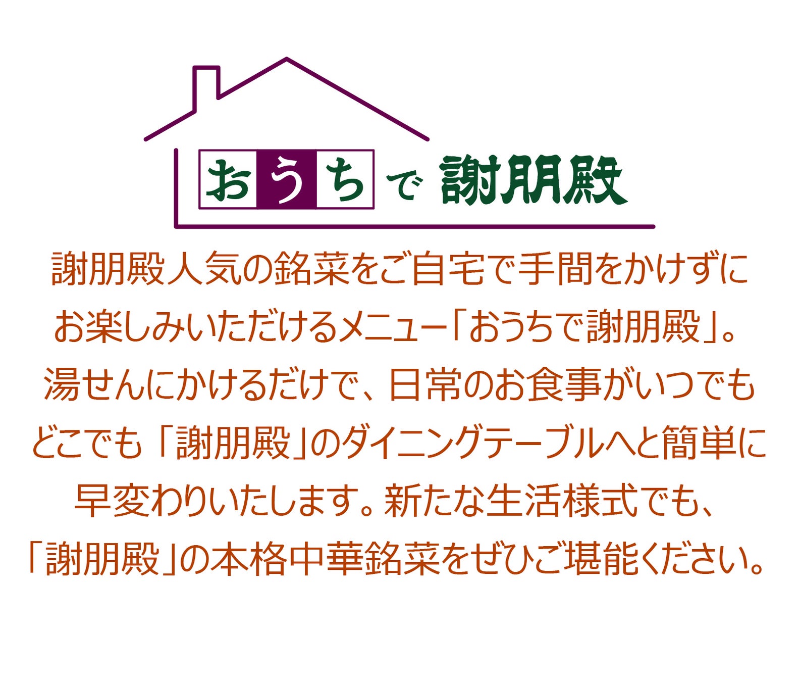 このたび、ご自宅で手間をかけずにお楽しみいただけるメニュー「おうちで謝朋殿」のメニューをさらに増やし、オンラインショップにご用意いたしました。ご自宅では湯せんにかけるだけで、日常のお食事がいつでもどこでも「謝朋殿」のダイニングテーブルに簡単に早変わりいたします。新たな生活様式でも、「謝朋殿」の本格中華銘菜をぜひご堪能ください。