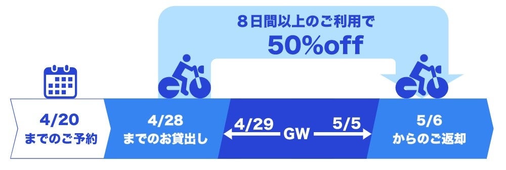 レンタル819では、ゴールデンウィークにご利用いただける『ゴールデンウィーク借りっぱなしプラン』をご用意いたしました。このプランは2022年4月29日から5月5日を跨ぐ、8日間以上のレンタルバイクのご利用料金が50%OFFとなるものです。ご予約の際、クーポンコード『2022gwtrip』と入力するだけ。ゴールデンウィークの遠出、または近所を散歩感覚で回る相棒にレンタルバイクをご利用されるのはいかがでしょうか?