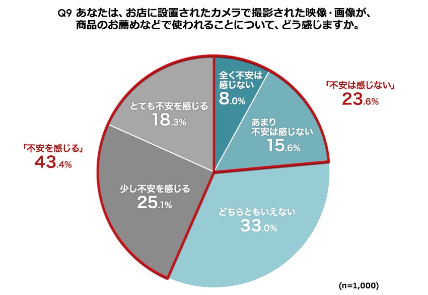 お店に設置されたカメラで撮影された映像・画像が、商品のお薦めなどで使われることについて、どう感じるか聞いたところ、「全く不安は感じない」 (8.0%)は1割に満たず、「あまり不安は感じない」(15.6%)を合算した「不安は感じない」(23.6%)は2割強にとどまる回答でした。