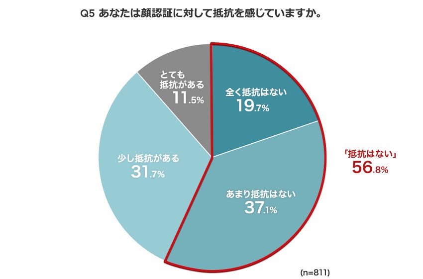 顔認証を認知している人に、顔認証に対して抵抗を感じているか聞いたところ、「全く抵抗はない」(19.7%)は2割弱で、「あまり抵抗はない」(37.1%)の4割弱を合算した「抵抗はない」(56.8%)は6割弱と、半数を超える回答でした。