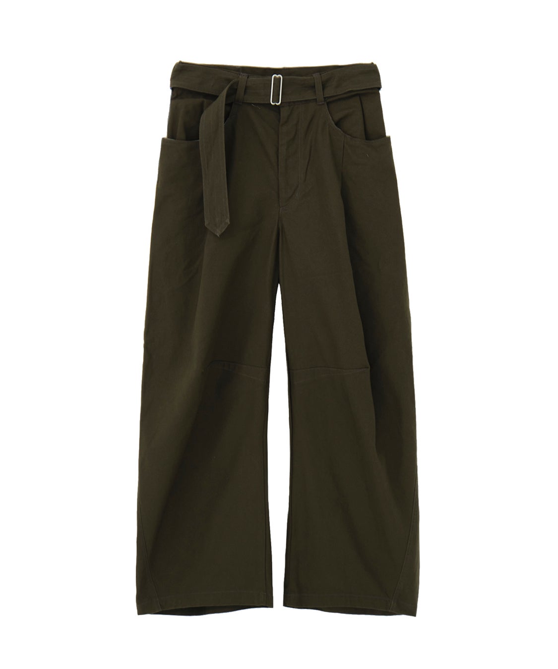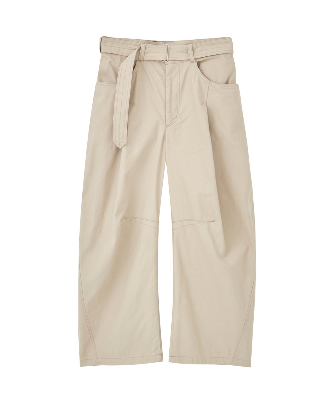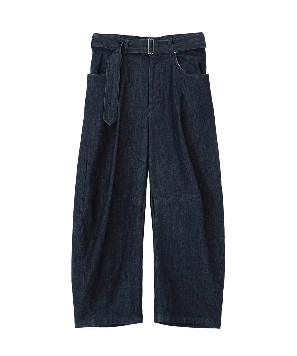 ボリューミーなシルエットのバルーンベルテッドチノ・デニムパンツ。⽴体的なシルエットの出やすい厚みとバリっとしたハリコシある素材を採⽤。(オー ガニックコットンを贅沢に使⽤したストレッチデニム。太番⽷を使⽤し、打ち込みもしっかりと⼊っているサージ素材。)バナナのような湾曲したパターン をタックやダーツでツイストさせています。不思議と合わせやすいシルエットと経年変化が期待できる本格素材。履きこむ程に馴染んでいき体にフィット して着⼼地とシルエットが向上していきます。また、ベルトがあることでタックインスタイルにもおすすめです。