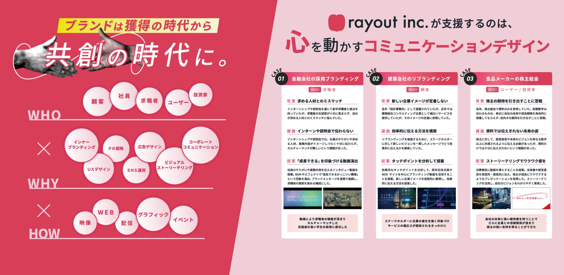 rayoutではまずお客様が抱えるビジネス課題を分析した上で、明確化されたステークホルダーに向けて適切な戦略を策定し、ターゲットの心を動かすコミュニケーションをデザインすることで、お客様を支援いたします。