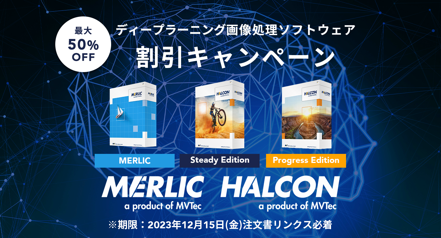 また、リンクスでは、世界最先端画像処理ライブラリ「HALCON」、および、オールインワン画像処理ツール「MERLIC(マーリック)」*の最新バージョンリリースに伴い、ディープラーニング画像処理ソフトウェアが最大50%OFFとなるキャンペーンを開催しています。ご注文の期限は【12月15日(金)まで】ですので、この機会にぜひディープラーニング画像処理の導入をご検討ください。詳細情報はキャンペーン特設サイトをご確認ください。