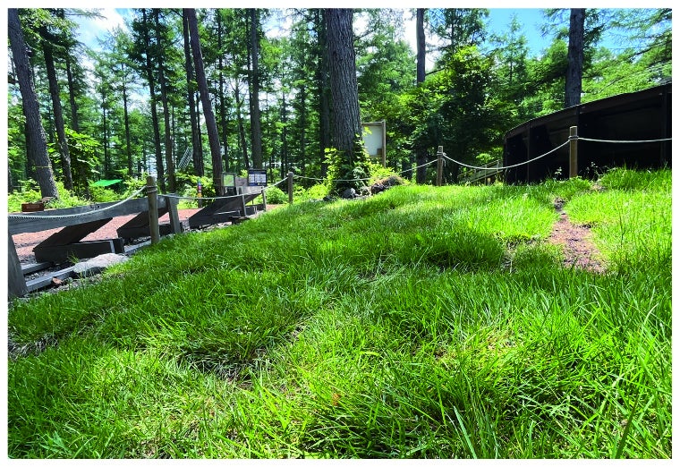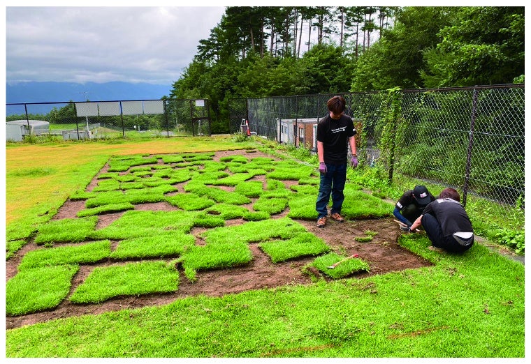また、昨年近隣のサッカー場より廃棄予定の芝を移植・整備。芝は細かい葉が密集して地面を広く覆うため、葉から水分を蒸発させることでまわりの熱をやわらげ、涼しさを生み出します。