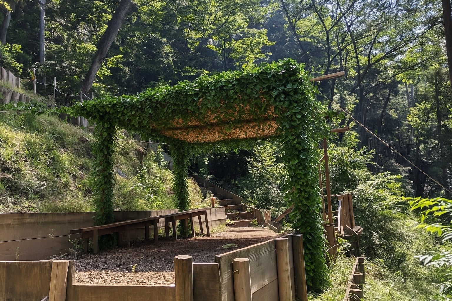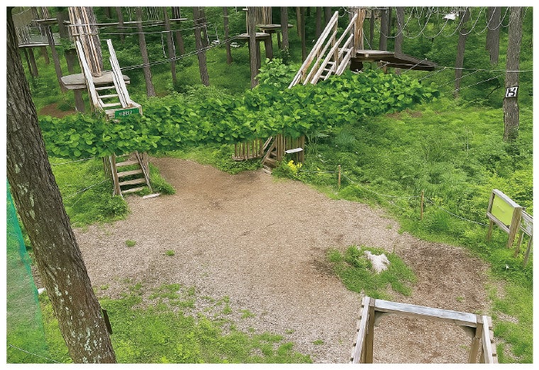 フォレストアドベンチャー・フジでは、自生しているフジのツルを移植し、「緑のトンネル」や「緑の屋根」を整備。木陰の通路として利用することで、日中の暑さを和らげます。