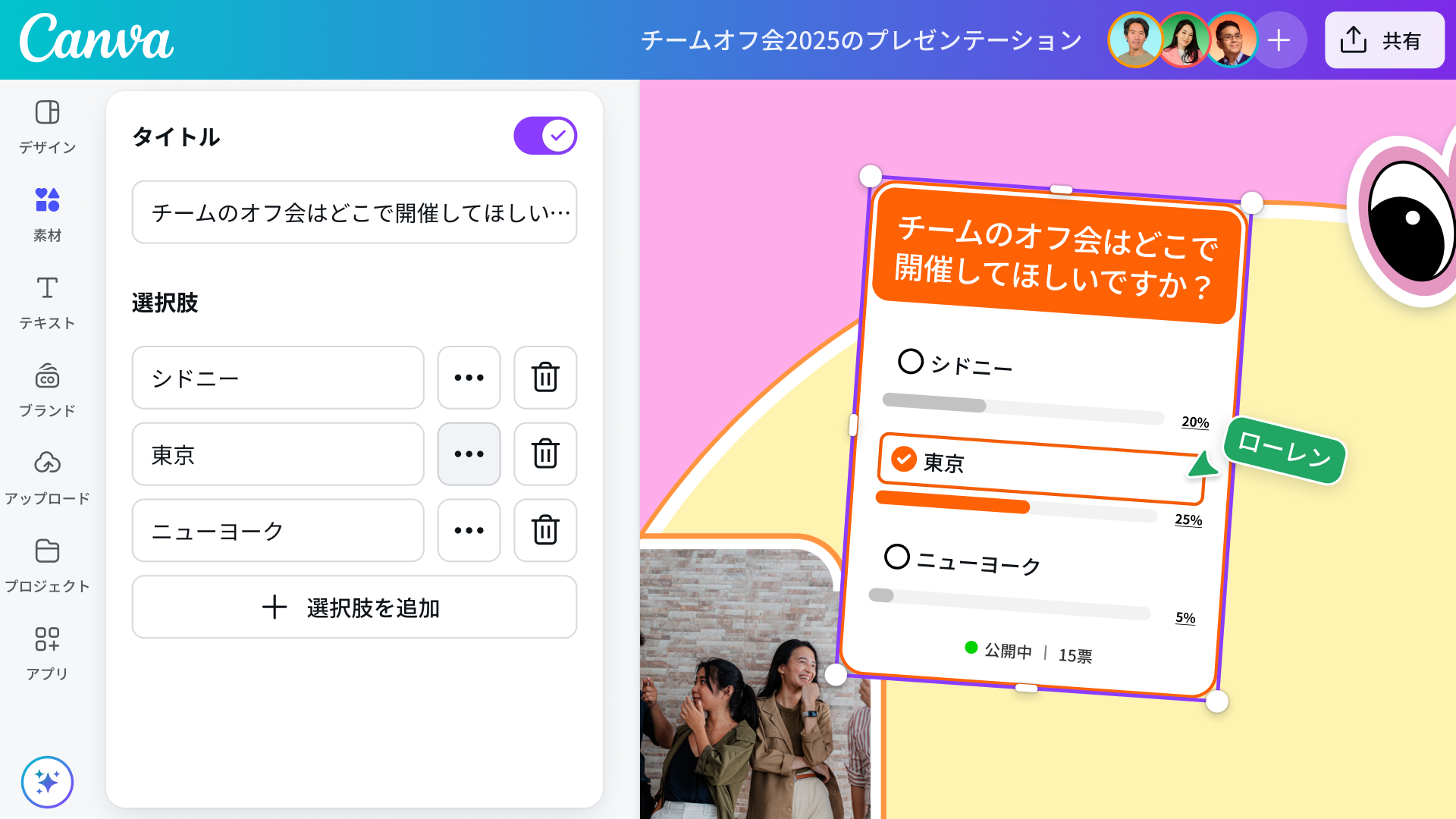 ビジュアルツールキットとマジックスタジオを導入するユーザーの増加により、Canvaのユーザー数は過去1年間で2倍の成長を記録しました。日本では、プレゼンテーションとSNSテンプレートが最も人気のある文書タイプであり、AIツールでは写真用の背景除去機能が最も多く使用されています。過去1年間にCanvaで作成されたプレゼンテーションの数は4,900万点を超え、Canvaは日本のチームや組織にとって頼りになるビジュアルコミュニケーションプラットフォームとして浸透してきています。