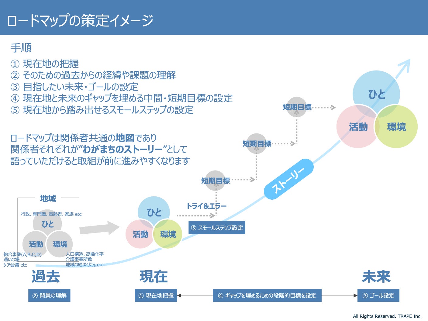 「素敵な役割のあふれる日常を創る」をビジョンに掲げる株式会社TRAPE(本社:大阪府大阪市、代表取締役社長:鎌田大啓)は、well-beingデザインを通じて人々、組織、地域に新たな可能性や価値を提供しています。その一貫として、令和4年度には、厚生労働省の老健事業「都道府県による市町村支援に活用するための支援パッケージ策定に係る調査研究」に取り組み、「地域づくり支援ハンドブックvol.1.0」を作成しました。また、これまで都道府県・市町村の高齢セクターの皆さんが安心して頼りにできる企画―デザインー実行まで一気通貫の事業パートナーとして、さまざまな都道府県・市町村の地域づくり(地域支援事業・総合事業)に取り組んできました。