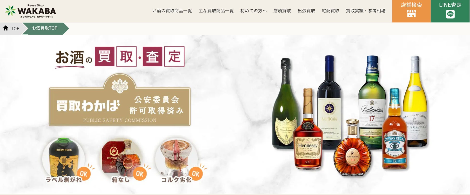 お酒買取はブランデーやウイスキーなどの洋酒が中心。駐車場も完備した立ち寄りやすい店舗で、コンディションの悪いお酒でも査定可能です。