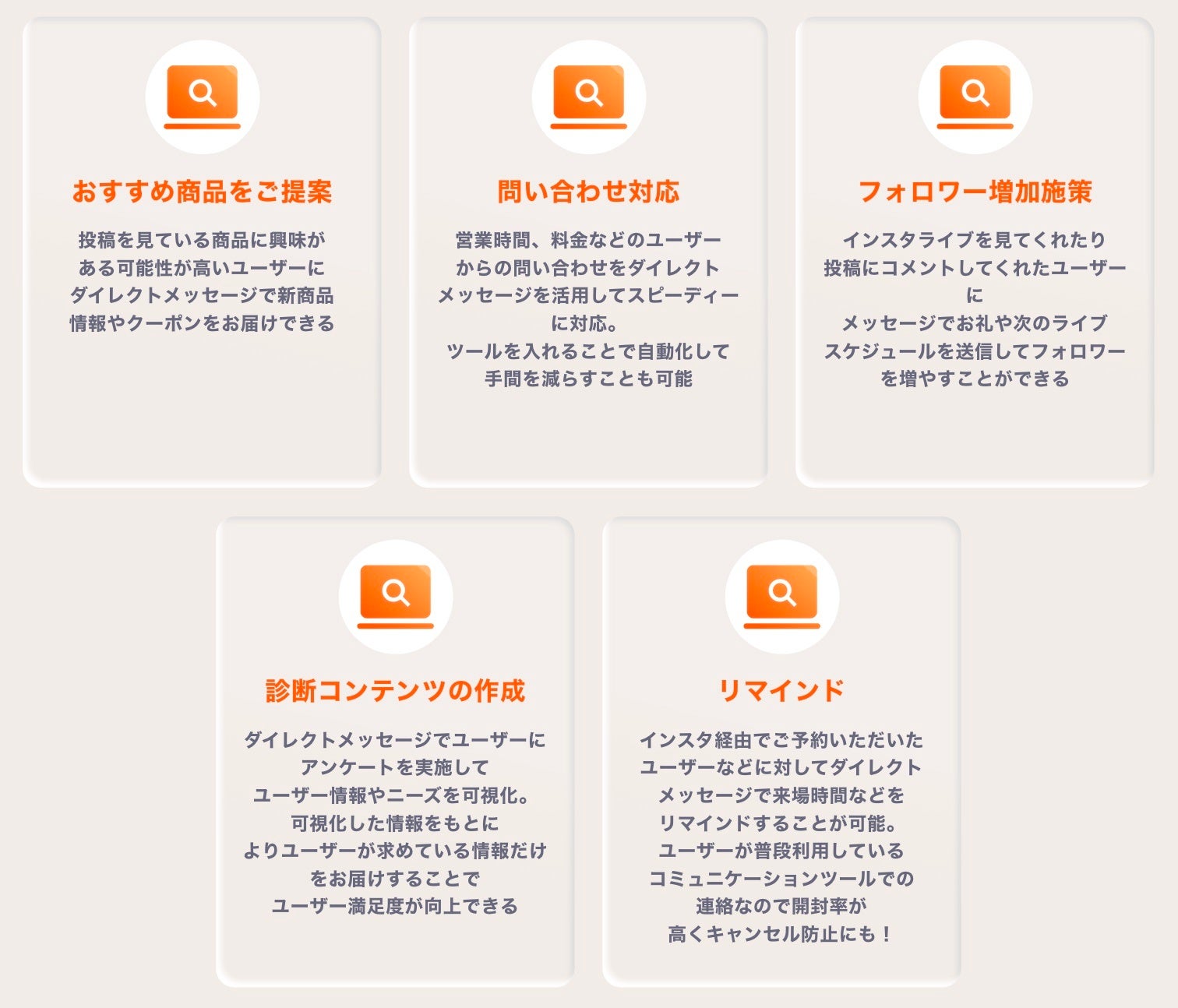 おすすめ商品の提案や問い合わせ対応、フォロワー増加施策、診断コンテンツの作成、リマインド配信などさまざまなマーケティング施策を提供しています。当社が持つInstagramメッセージマーケティングのノウハウを活用し、効果的なマーケティング戦略の立案やメッセージの作成、配信タイミングの最適化など、あらゆる面でのサポートします。