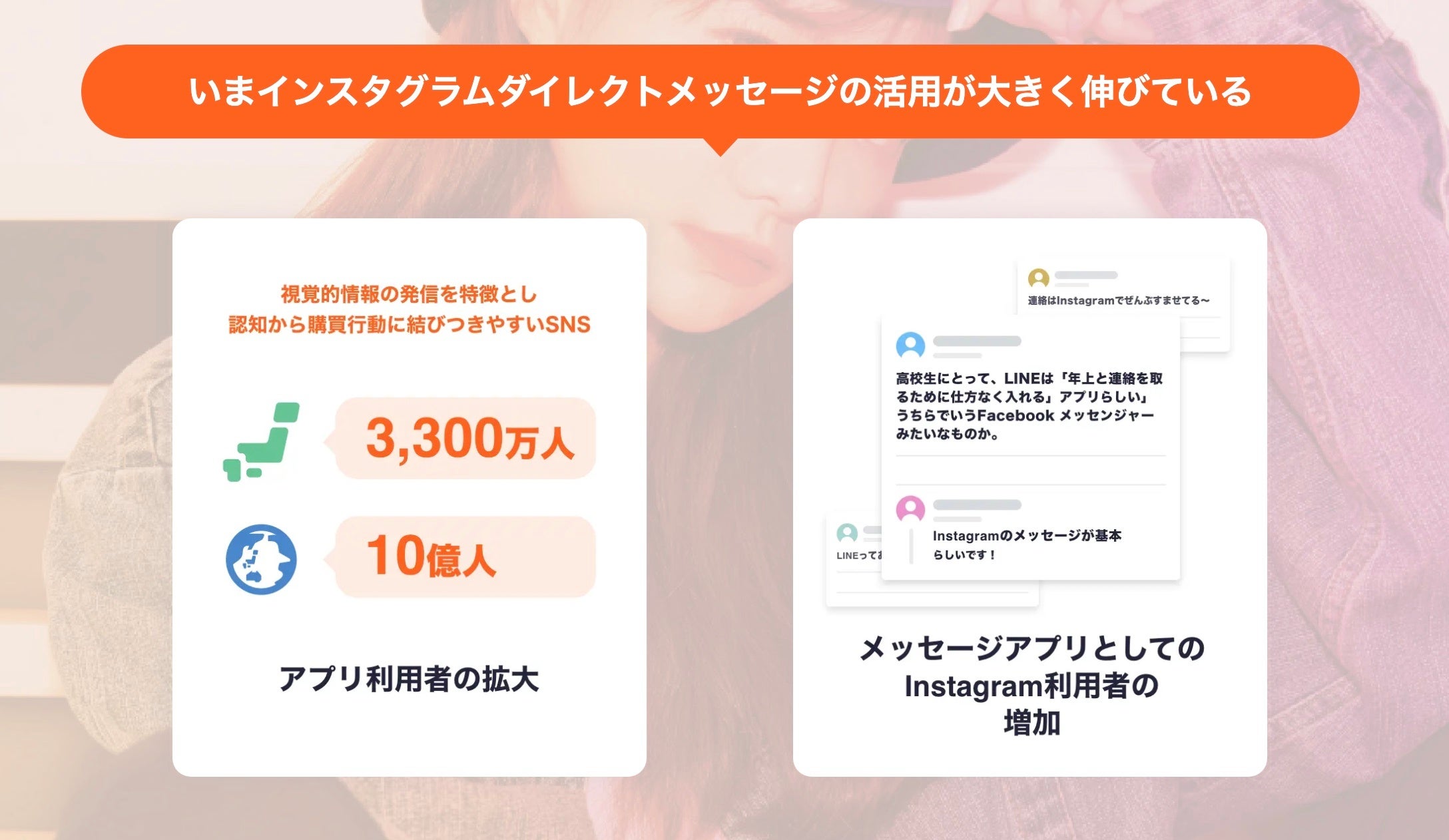 また、Z世代をはじめとする若者の間で、LINEではなく、Instagramダイレクトメッセージでのやりとりが主流になっています。