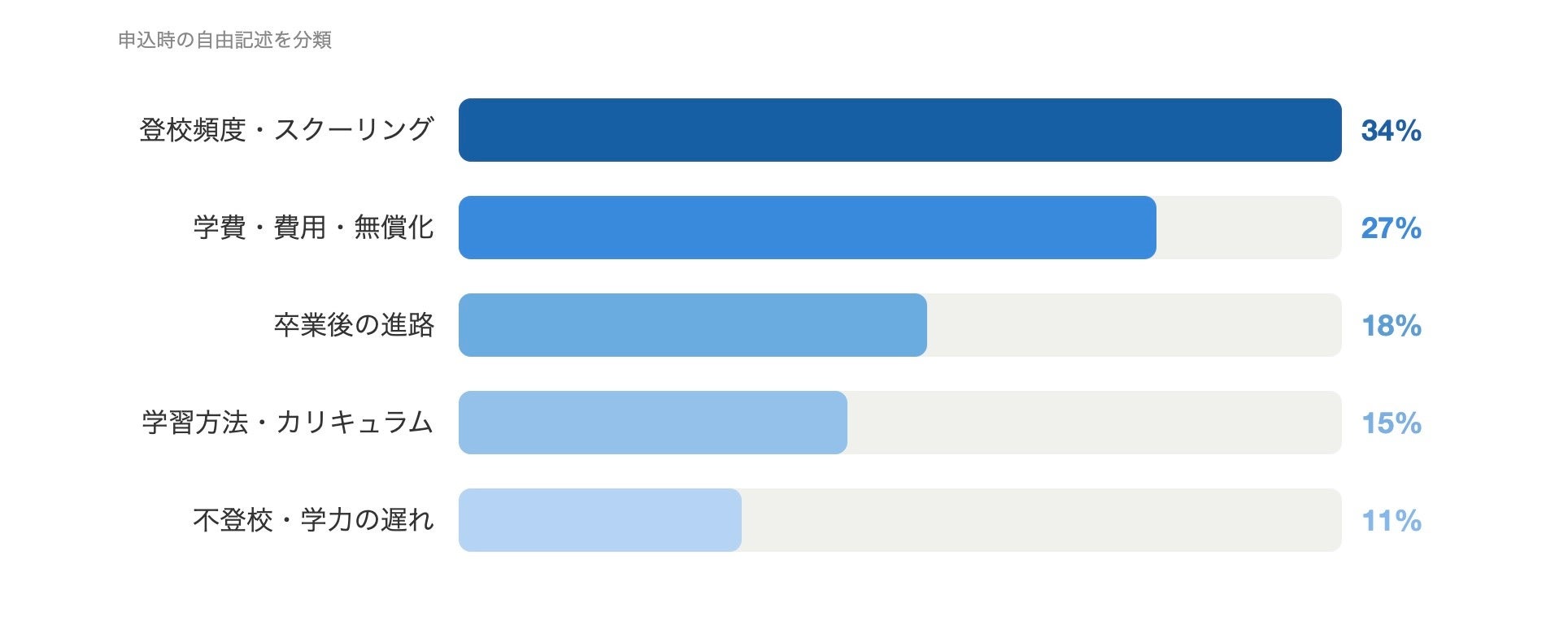 申込時に自由記述で寄せられた質問を分類したところ、最も多かったテーマは「登校頻度・スクーリング」(34%)で、「学費・費用」(27%)を上回りました。「週何日通うのか」「毎日通学するコースもあるのか」「宿泊のスクーリングは必須か」など、通信制高校の基本的な仕組みに関する質問が中心です。通信制高校の学び方は多様化しているのに、その具体像が保護者の方にまだ届いていないことがわかりました。