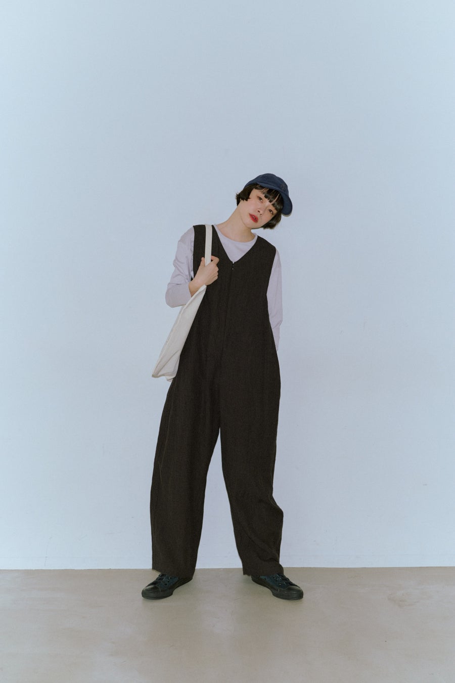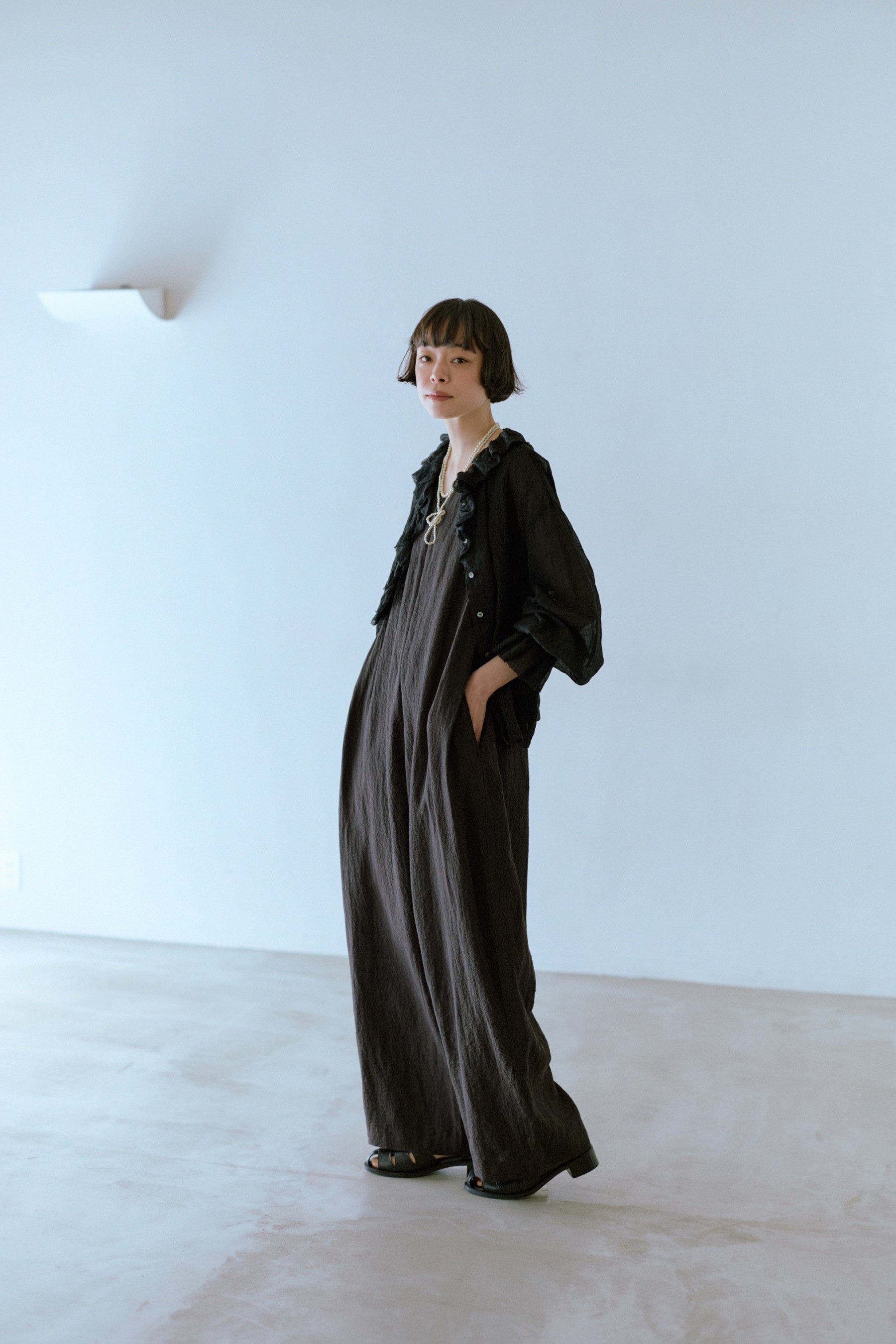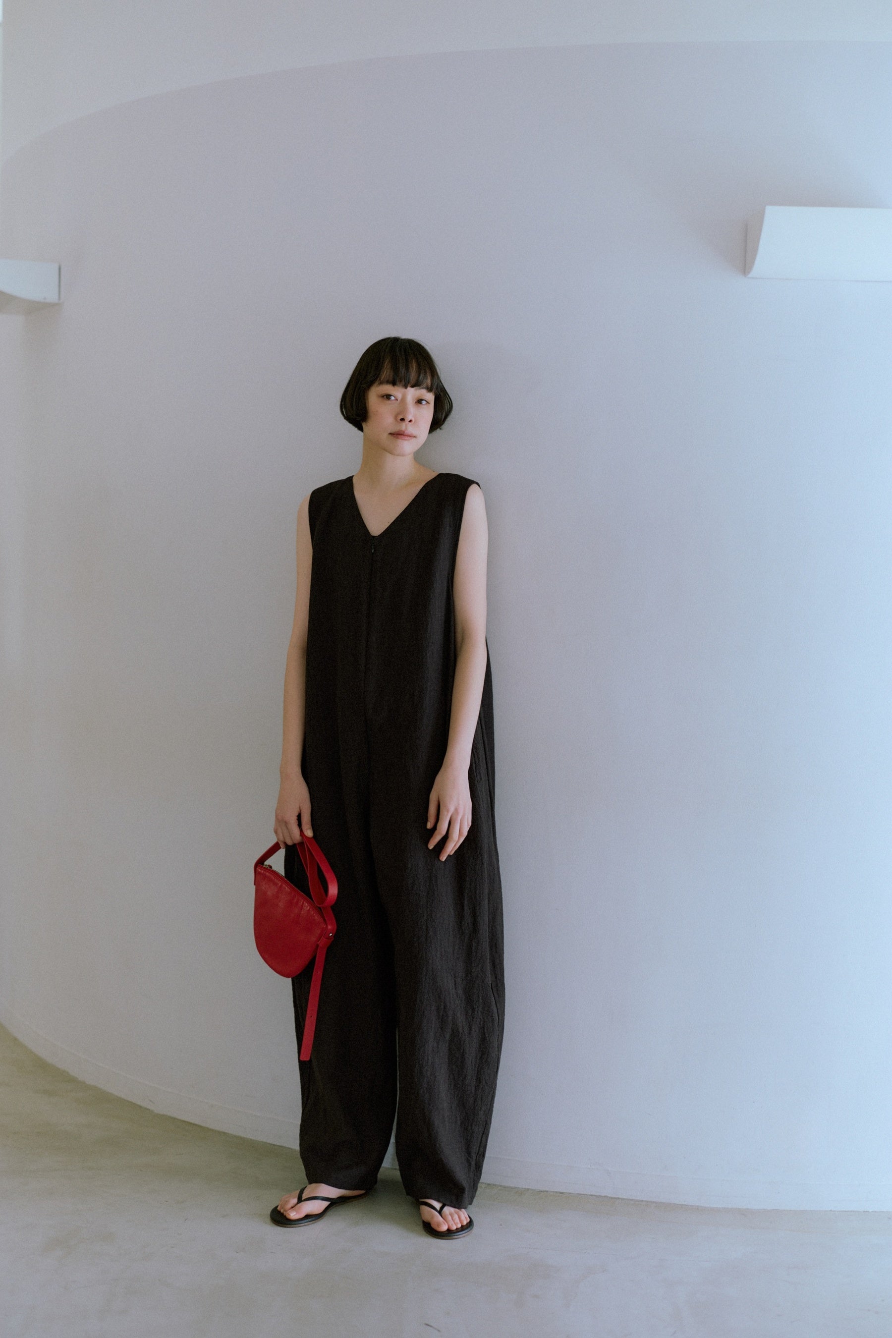 リネンに軽さと清涼感を出すため、いくつかの合成繊維をブレンド。立体的なボリュームを出した、エッグシルエットのサロペット。フロントはすっきりとしたVネックで、フロントは着脱しやすいファスナー仕様に。リラックスして着られる一枚。