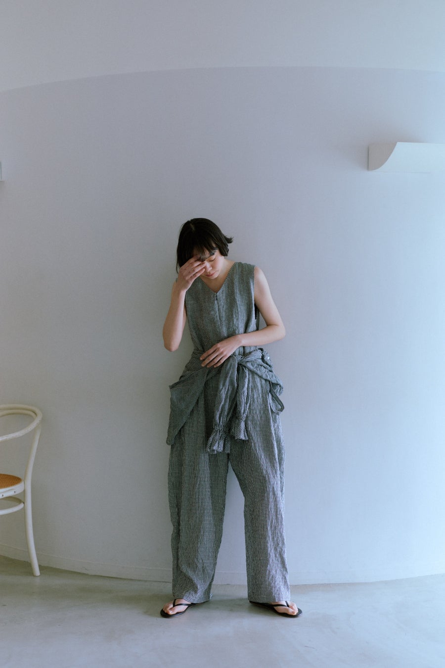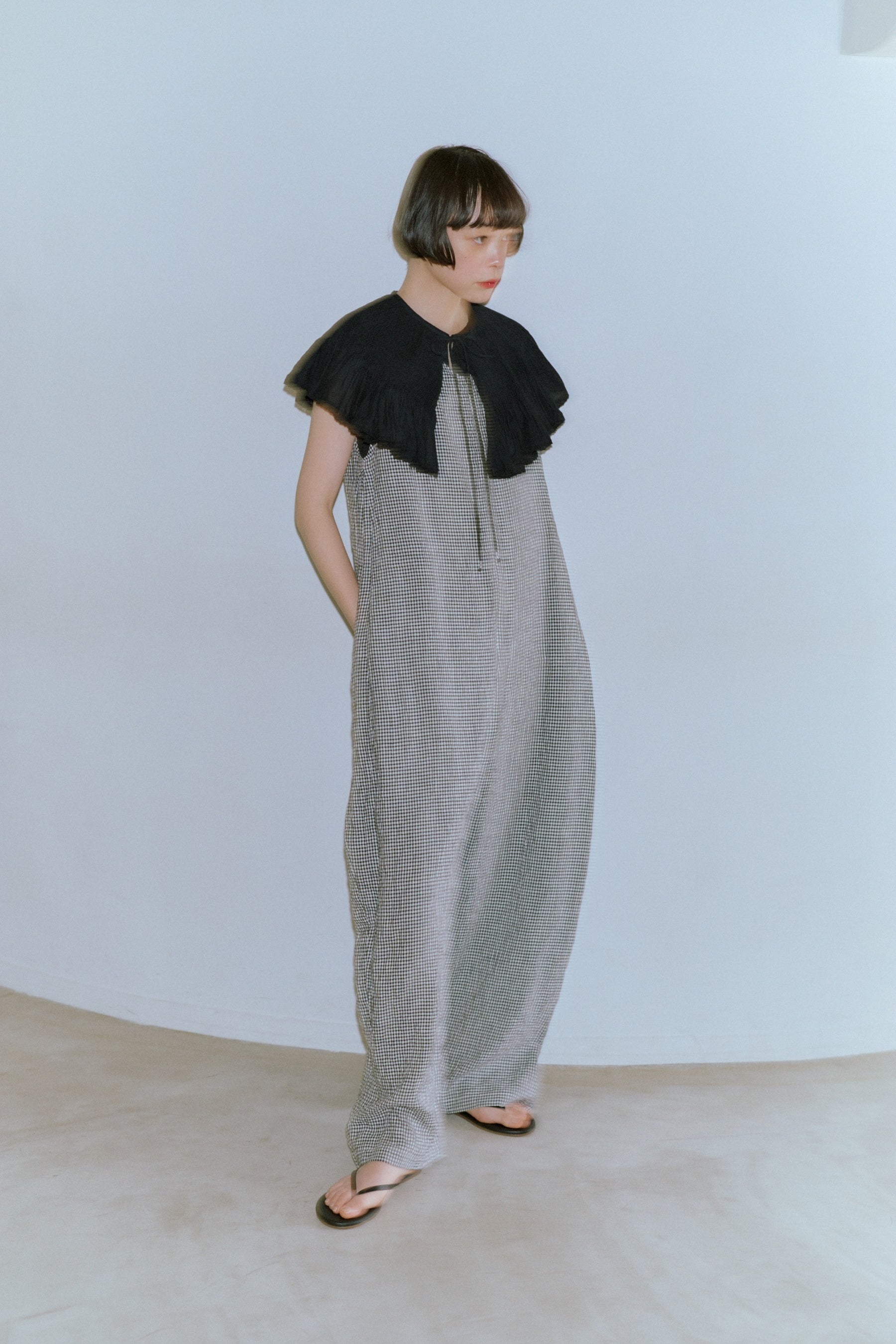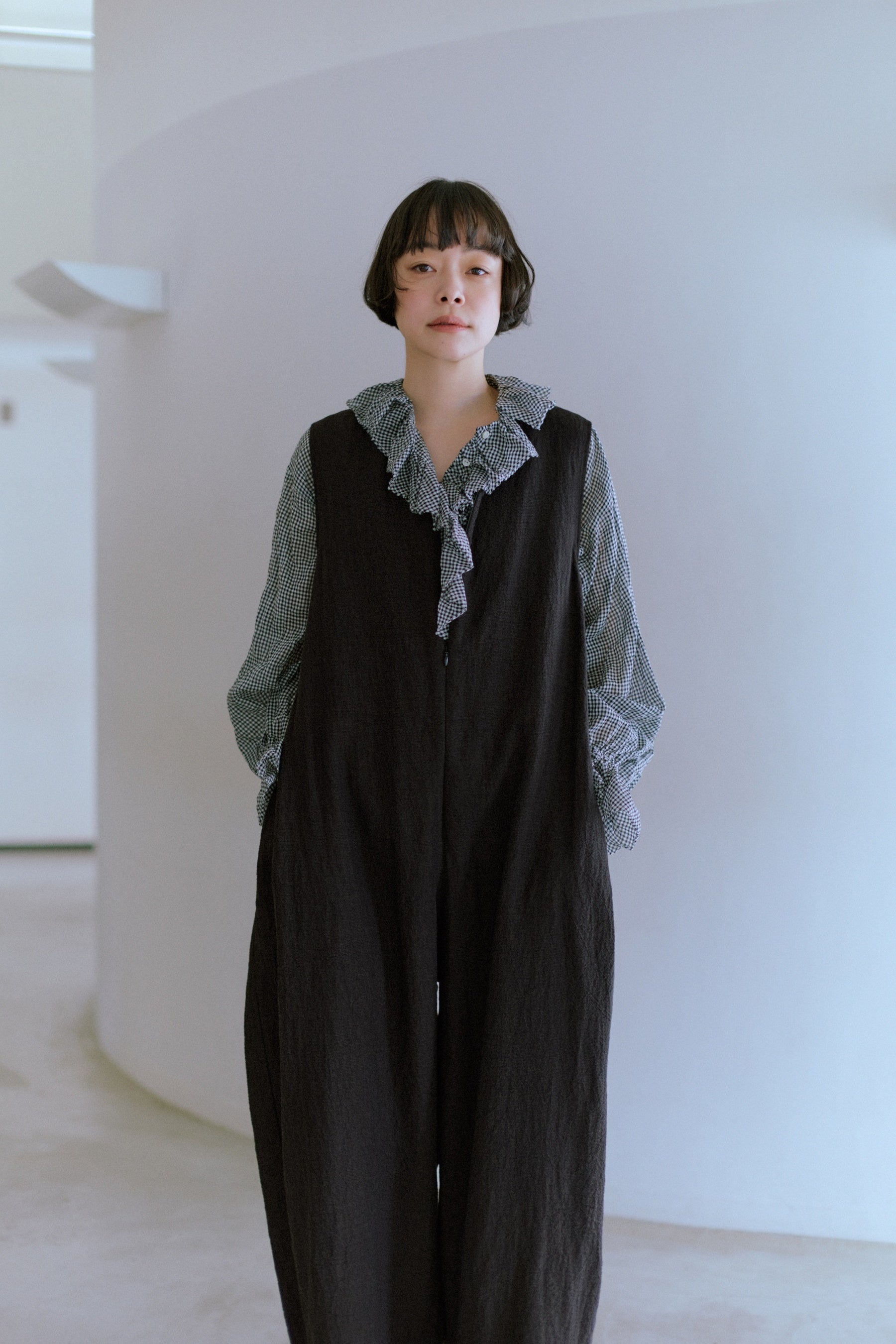 リネンに軽さと清涼感を出すため、いくつかの合成繊維をブレンド。立体的なボリュームを出した、エッグシルエットのサロペット。フロントはすっきりとしたVネックで、フロントは着脱しやすいファスナー仕様に。リラックスして着られる一枚。