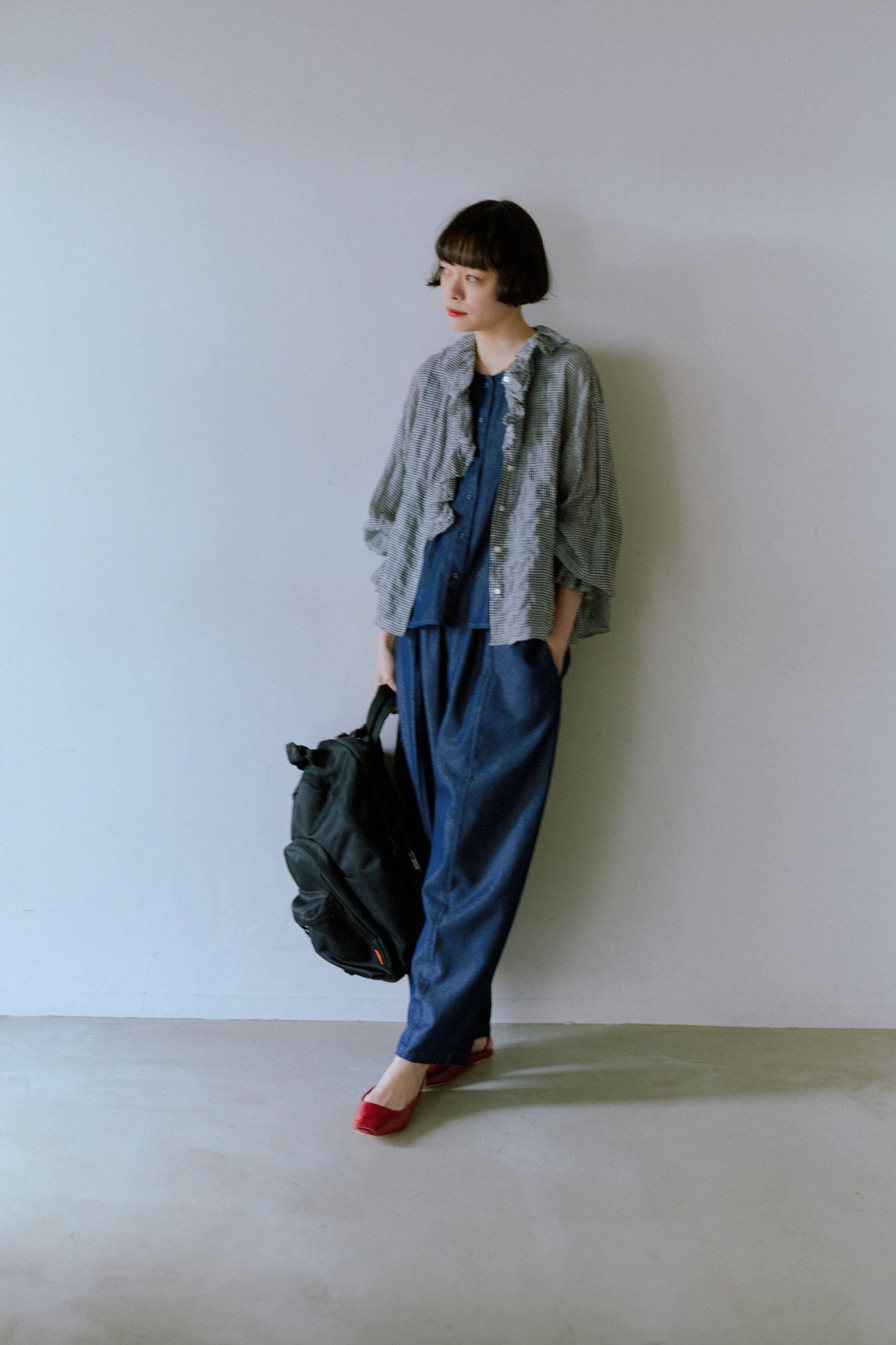 光に溶け込むシアー感のあるフリルブラウスと、エッグシルエットのリラクシーなサロペットパンツ。ゆるやかなフォルムにしなやかさを重ねた、2型のコラボレーションアイテムがラインナップ。