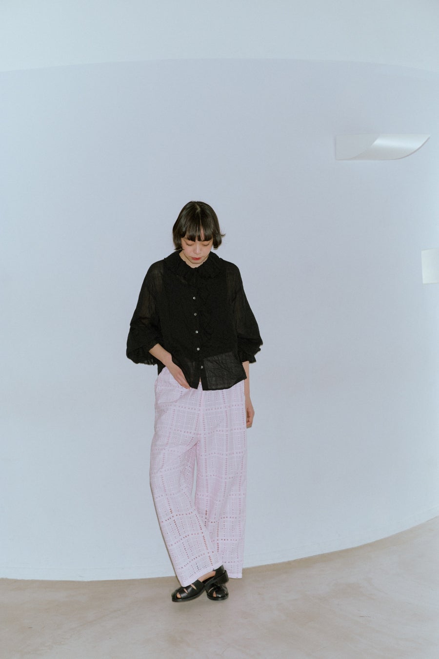 表面に凹凸感のある軽やかなシャーリング生地を使用。襟元に甘いフリルをあしらった、フェミニンなブラウス。フリルスリーブの袖口にはゴムを入れて、ブラウジングも可能なデザインに。程よいシアー感のある、大人ロマンティックな一着。