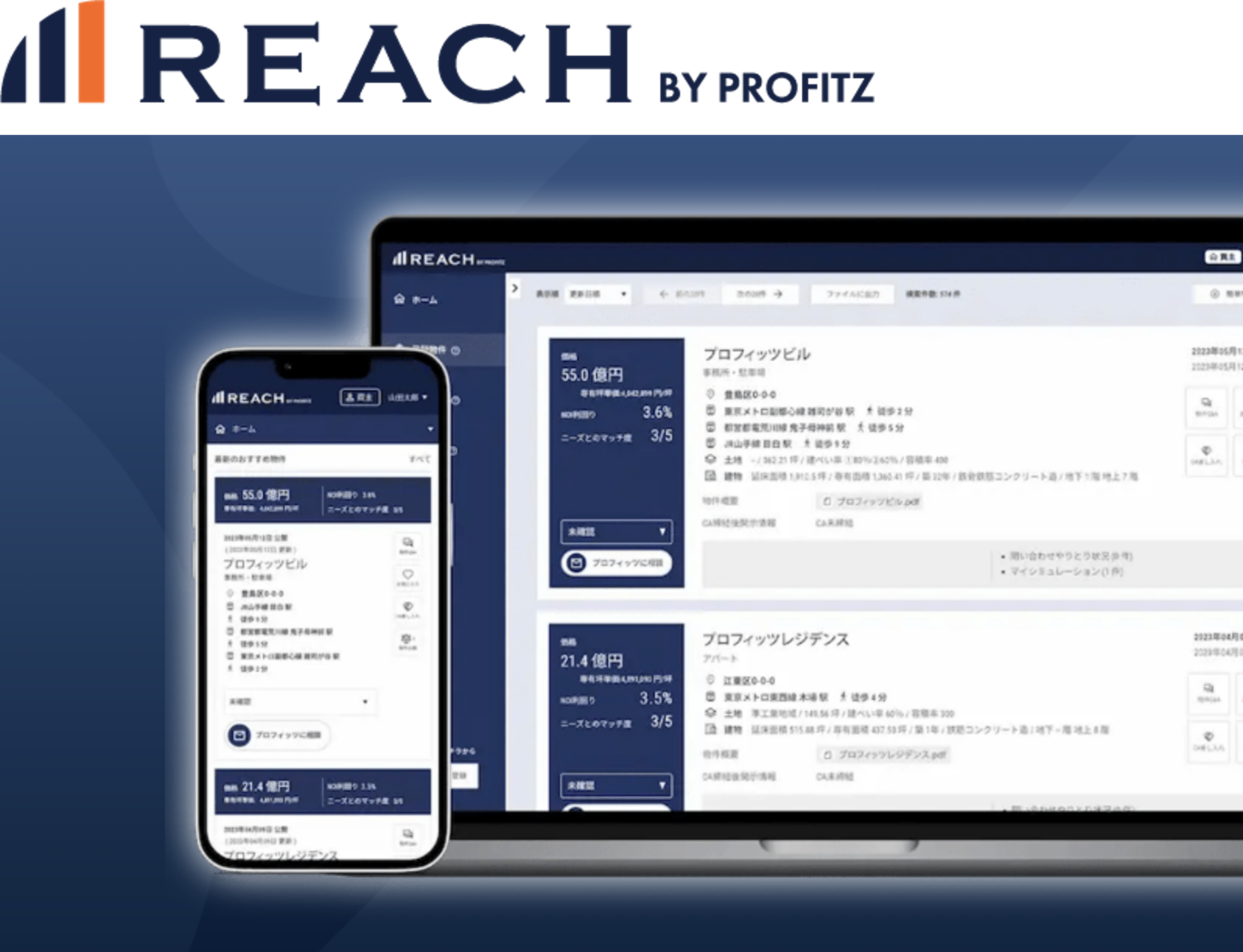 REACHは、プロフィッツのミッションである「投資を身近に、未来の循環を投資のパワーで創り出す」ことを目的として、売主/仲介会社・買主のそれぞれがこれまでアクセスできなかった、優良な物件情報・取引先を一つのネットワークで繋ぎ、新たなビジネス機会を創出する「BtoB不動産情報ネットワークサービス」です。