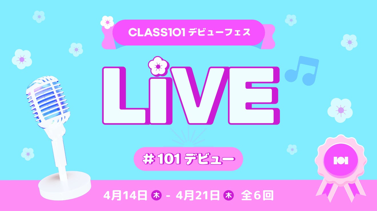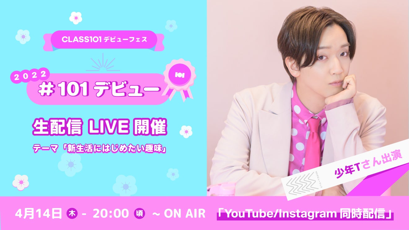 『CLASS101デビューフェス』では、2022年4月14(木)にシンガーソングライター・声優として人気沸騰中の少年Tさんをゲストに迎え、「新生活にはじめたい趣味」をテーマにした生配信をはじめ、CLASS101で活躍する人気クリエイターによる「セルフブランディング」をテーマにしたインスタライブ、また「新しい“好き”を見つけ、新しい“自分”に出会う」きっかけになって欲しいという願いを込めて、厳選したオンラインレッスンを101円で受講できる「101円 SHOP」をオープンします。