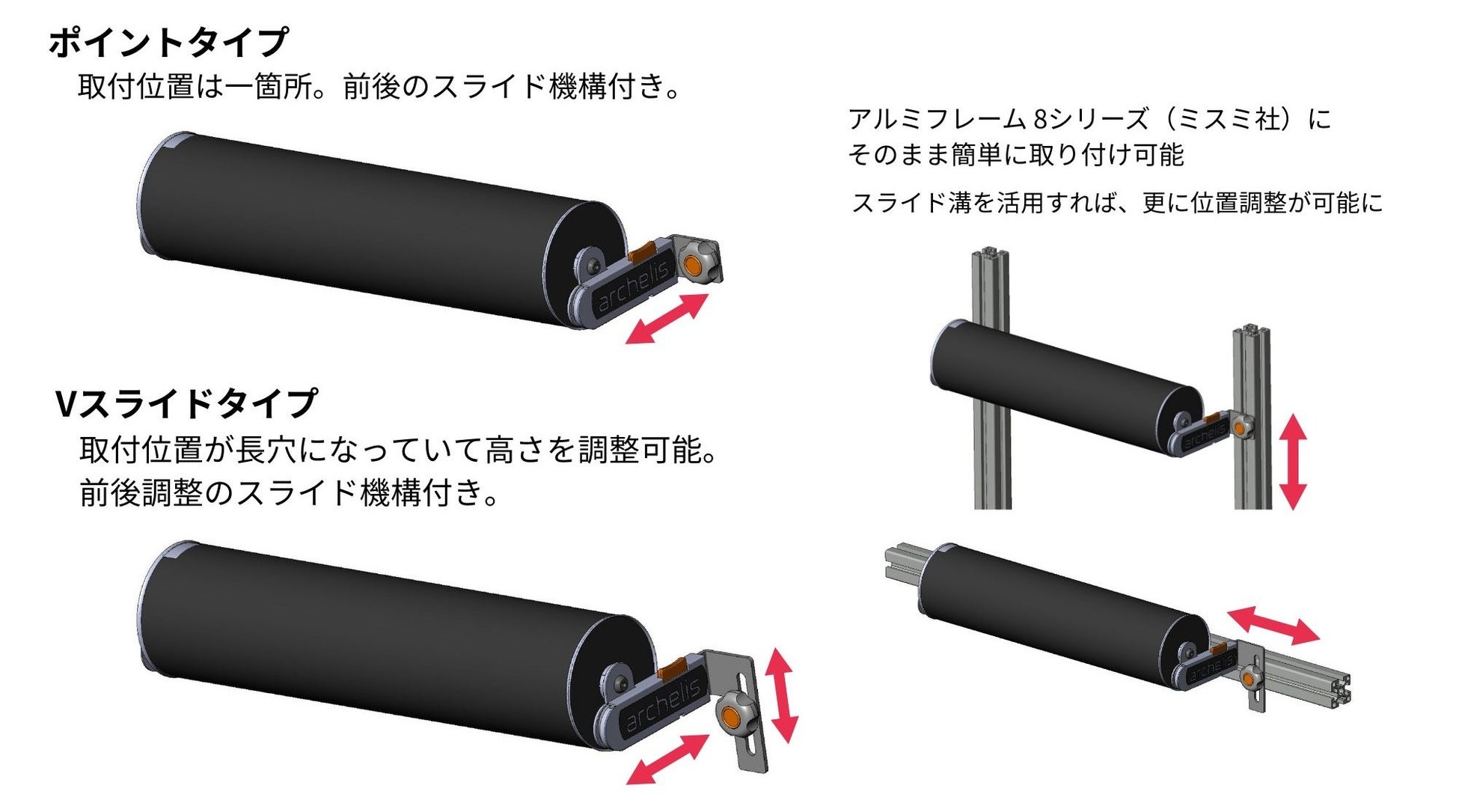 「ユニバーサルアタッチメント」とは、工場や店舗などで使用されている既存設備に対し、自由に取り付けができる方式です。特に工場設備で多く使用しているアルミフレームには工具などを使用せずに簡単に取り付け可能です。