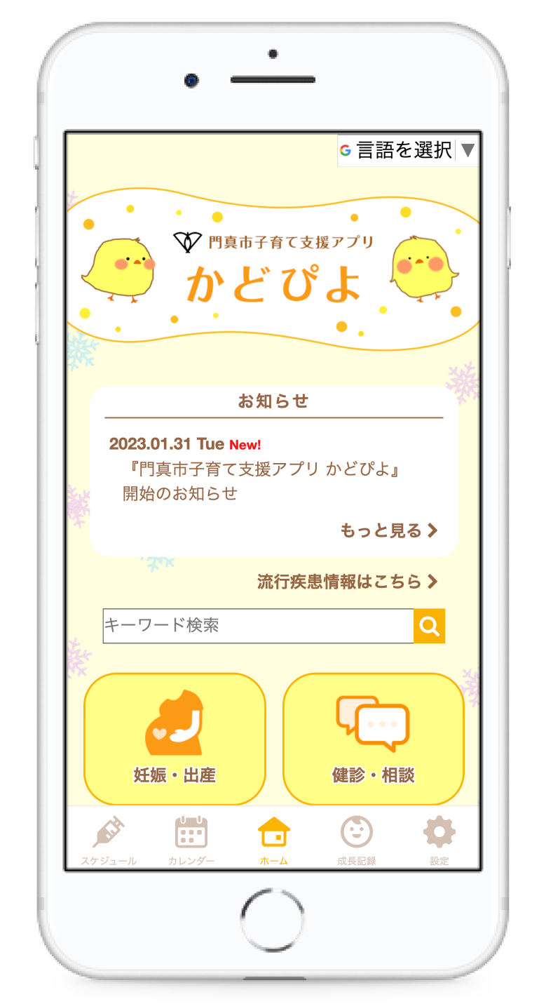 妊娠期から子育て期にわたる切れ目のない支援の一環として、このたび健診や予防接種の管理、子育て情報のお知らせを行う「門真市子育て支援アプリ かどぴよ」の運用を開始しました。多くの方にご活用していただけるよう子育て情報コンテンツの拡充や周知を図っていきます。