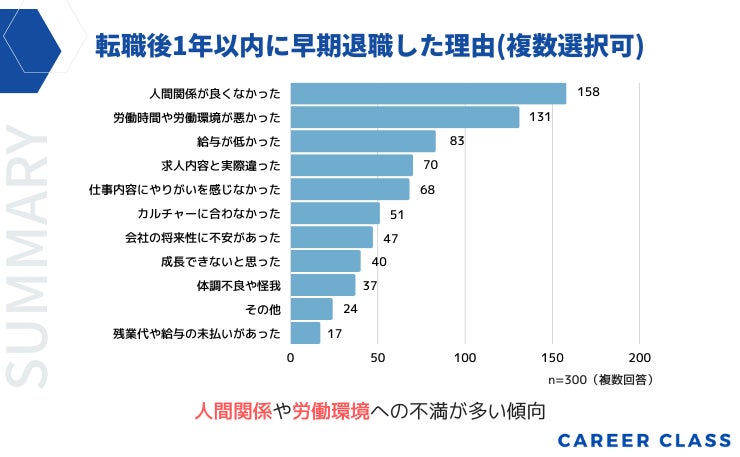 ・転職後1年以内に早期退職をした理由は、1位「人間関係が良くなかった」2位「労働時間や労働環境が悪かった」3位「給与が低かった」という結果になりました。
