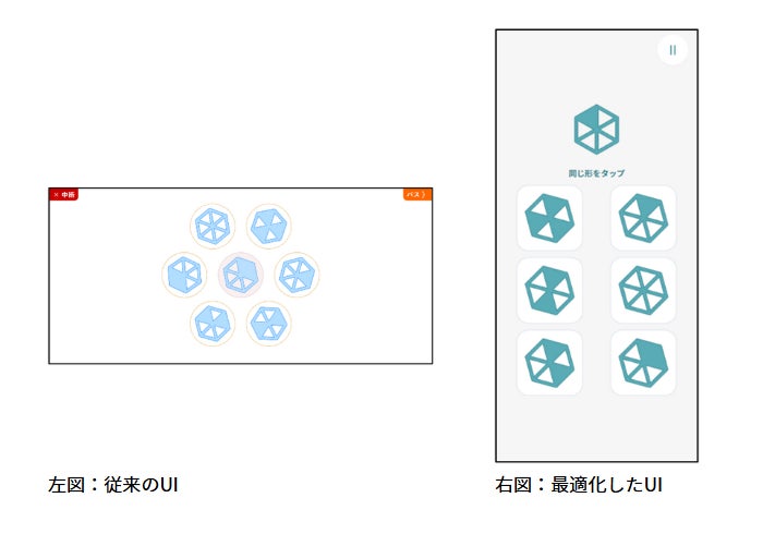 「脳体力トレーナー CogEvo SMART」は、当社が長年培ってきた認知機能に関する知見に基づき開発された「CogEvo」の主要な評価項目である「5種バランスチェック」を、スマートフォンでより手軽に実施できるよう従来のPC/タブレット向けのUIを最適化(左図:従来のUI、右図:最適化したUI)した新サービスです。認知機能の主要な5つの側面(空間認識力、見当識、記憶力、計画力、注意力)を、ゲーム感覚で楽しくチェックしトレーニングできる点が特長です。