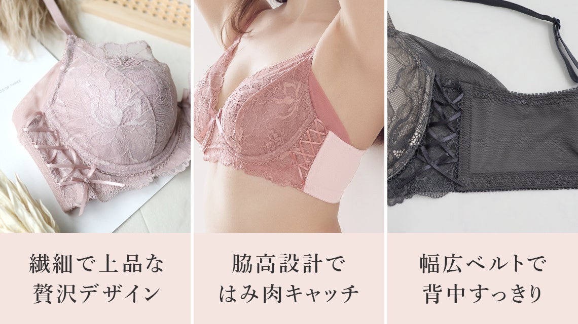 バスト全体を包み込む設計でソフトな引き上げ効果を実現し、美しい盛りバストに導きます。バストに沿ったレースがカップ浮きを抑え、ノンストレスな付け心地で誰もが虜に。