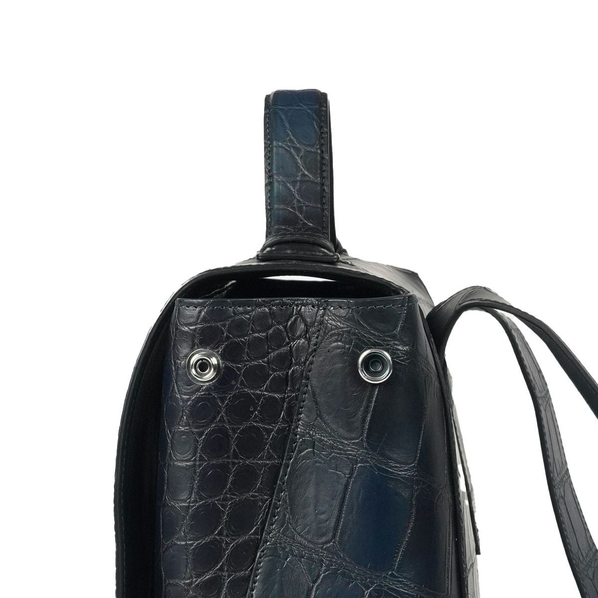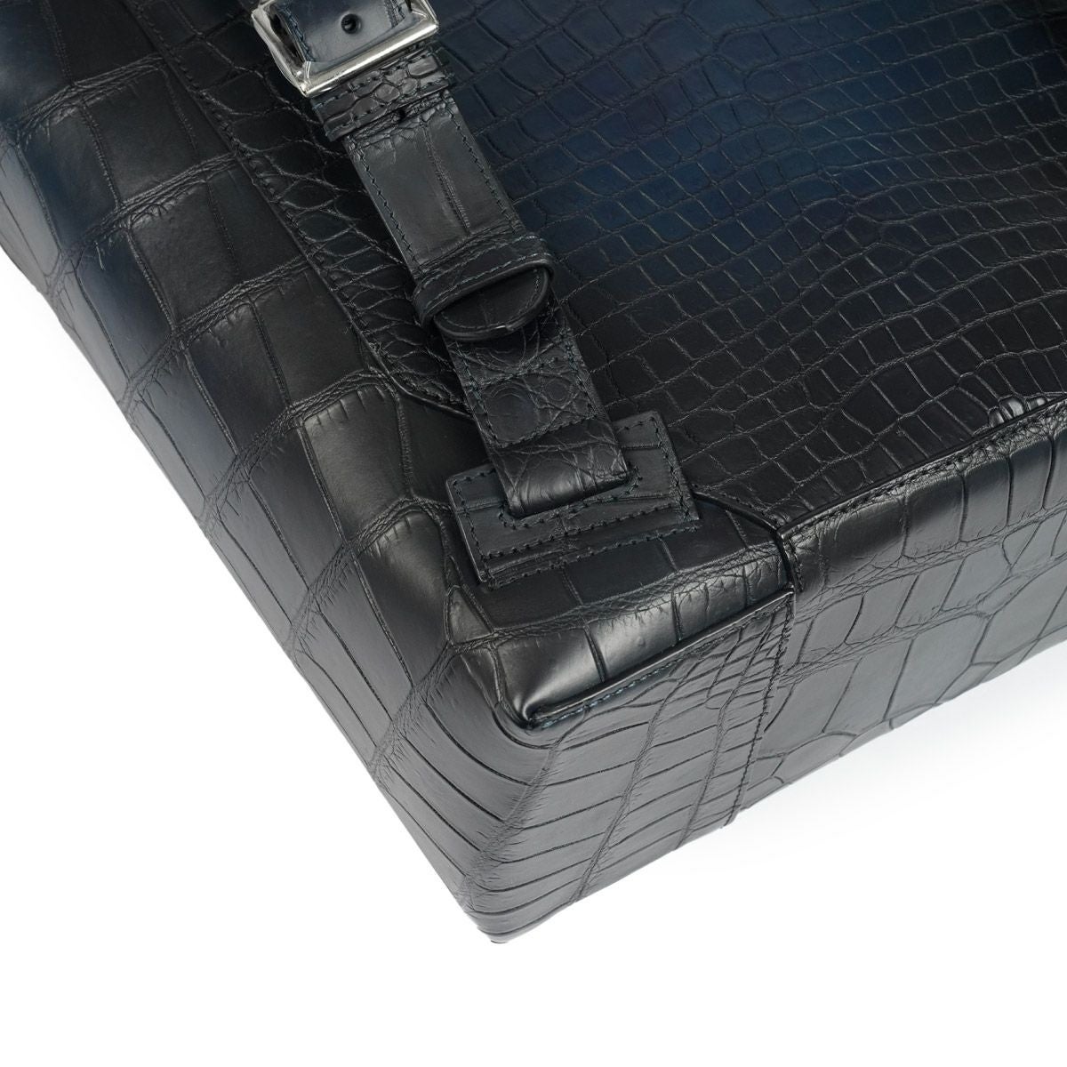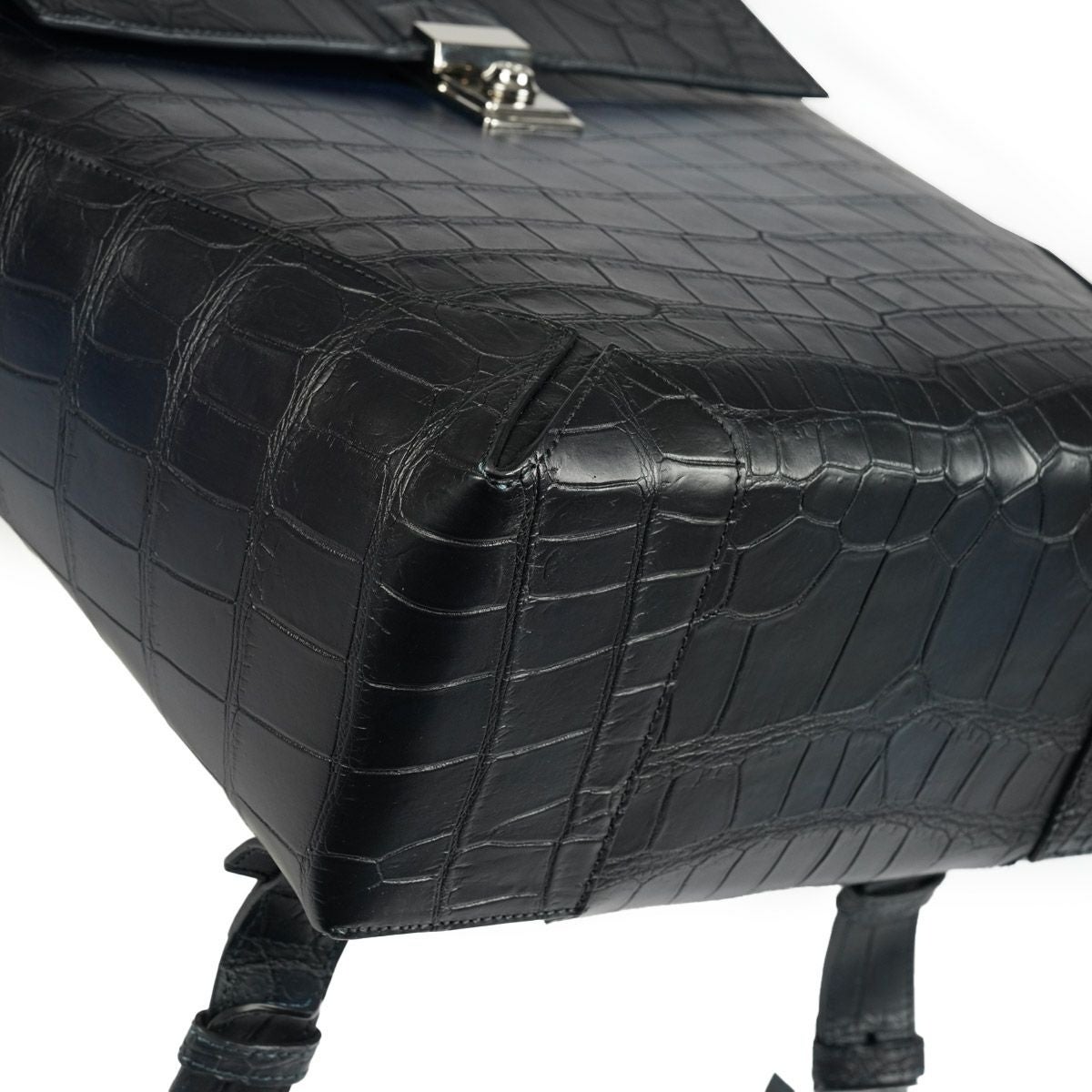 大型のクロコダイルを使用することで継ぎ目をできるだけ減らし、正面だけでなく背面やストラップなどの細部に至るまで腑の魅力を存分に堪能できる逸品に仕上がりました。