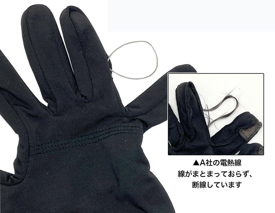 当社のインナーヒーターグローブは指先だけではなく、手の甲にも電熱線を配置しています。