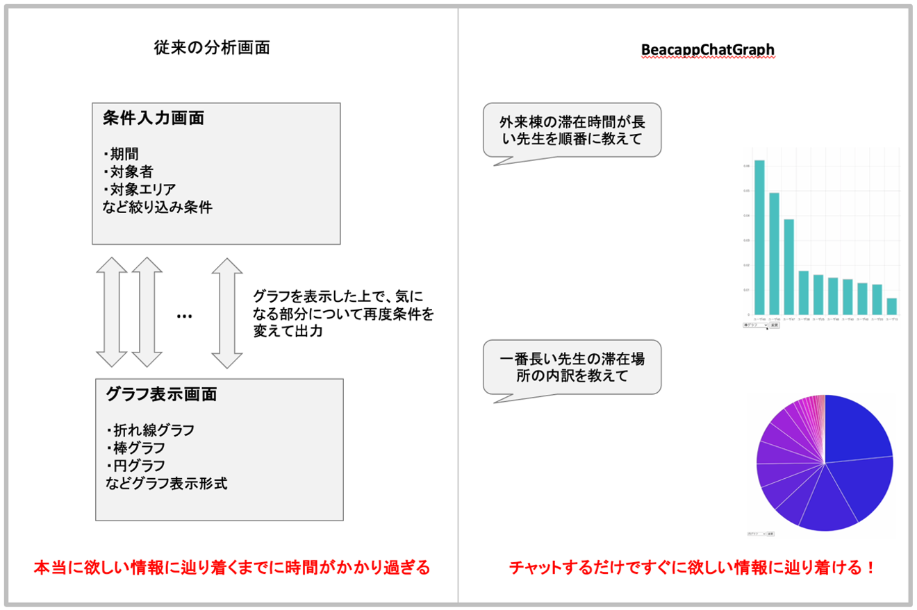 そこで、当社では、株式会社チェンジの「NexEmbark(ネクセンバーグ)」を導入し、ビーコンデータと連携することで、チャットで手軽に必要なグラフを出力できる「BeacappChatGraph」の開発に成功しました。