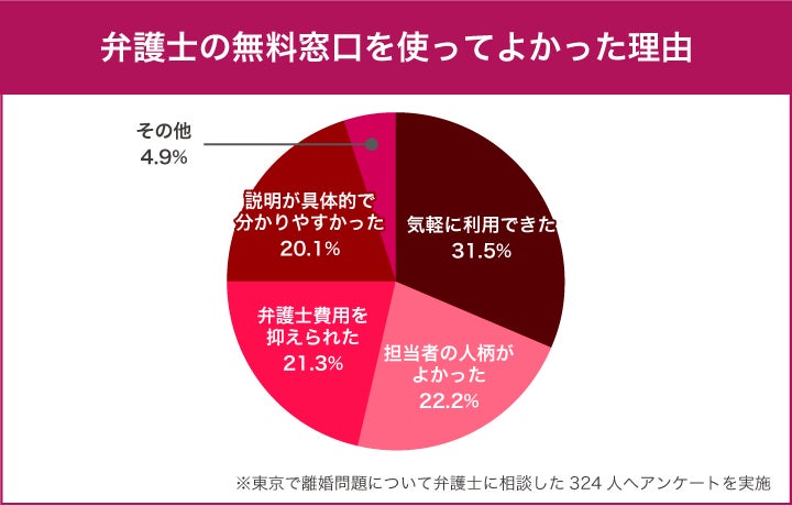 よかったと感じた理由は「気軽に利用できた」が1位で、「担当者の人柄がよかった」「弁護士費用を抑えられた」「説明が具体的で分かりやすかった」がそれぞれ20~22%とほぼ同じ割合です。