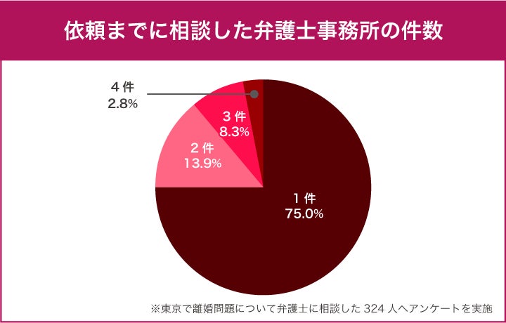 アンケート回答者のうち75%が、依頼までに相談したのは1件の弁護士事務所のみとなっています。2件まで合わせると、全体で88.9%と約9割を占めました。